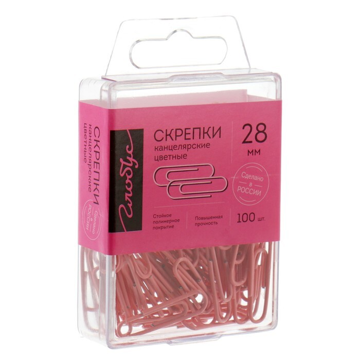 Скрепки канцелярские 28 мм цветные 100шт, GLOBUS розовые, евробокс