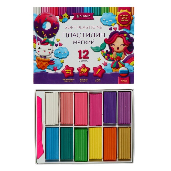 Пластилин GLOBUS, мягкий, 12 цветов, 240 г, со стеком