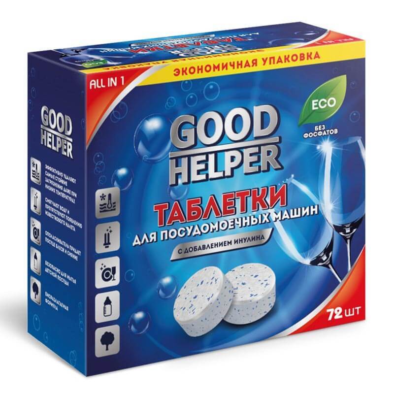 Таблетки для посудомоечных машин GOODHELPER DW-7220, безфосфатные, с добавл. инулина, 20 гр. 72 шт.