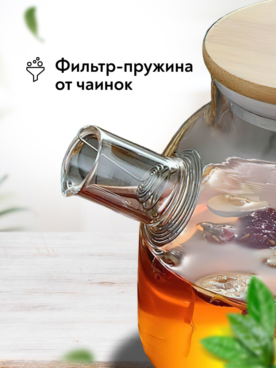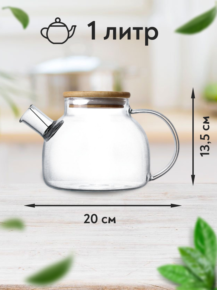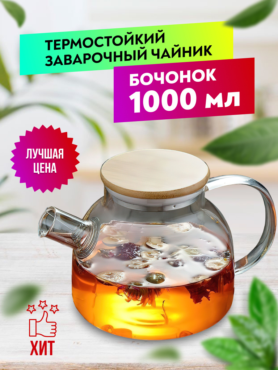 Чайник заварочный стеклянный 1 литр (1000 мл) Goodlac/ С фильтром пружиной / С кокосовой крышкой