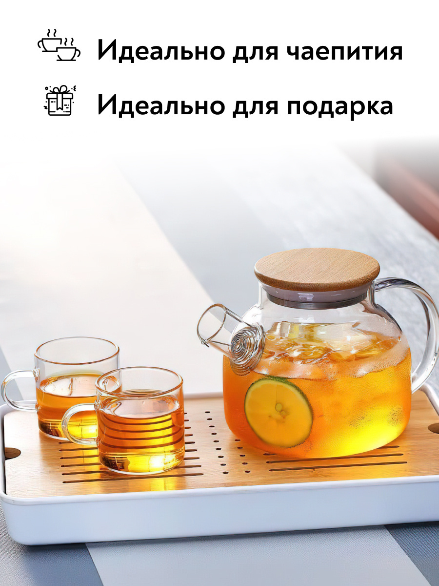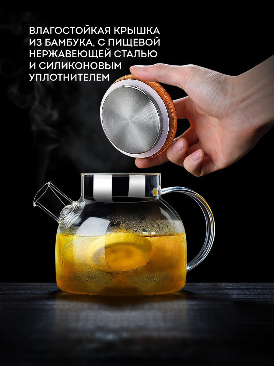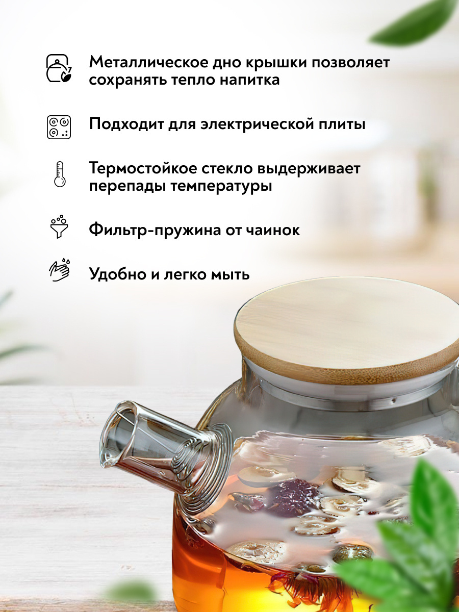 Чайник заварочный стеклянный 1 литр (1000 мл) Goodlac/ С фильтром пружиной / С кокосовой крышкой