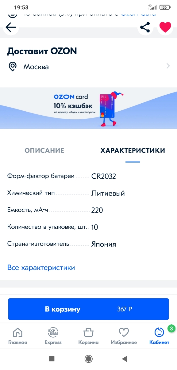 Батарейки литиевые GP Lithium, тип CR2032, 3V, 10шт. (Таблетка)