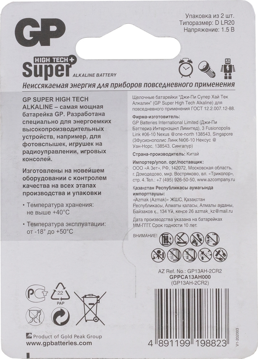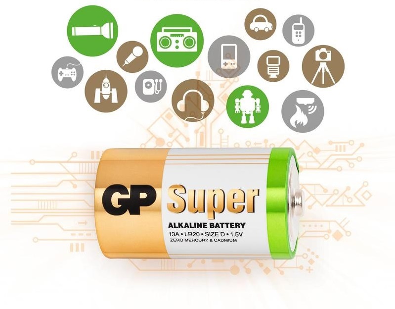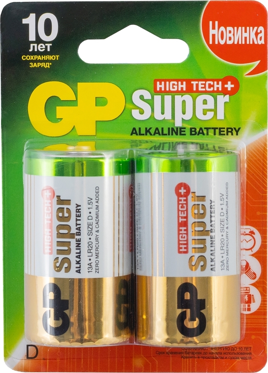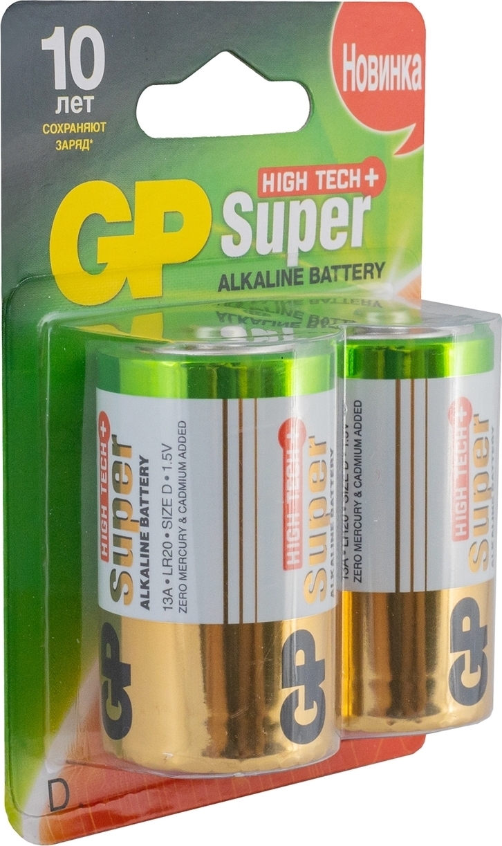 Батарейки щелочные (алкалиновые) GP Super High Tech, тип D, 1.5V, 2шт.