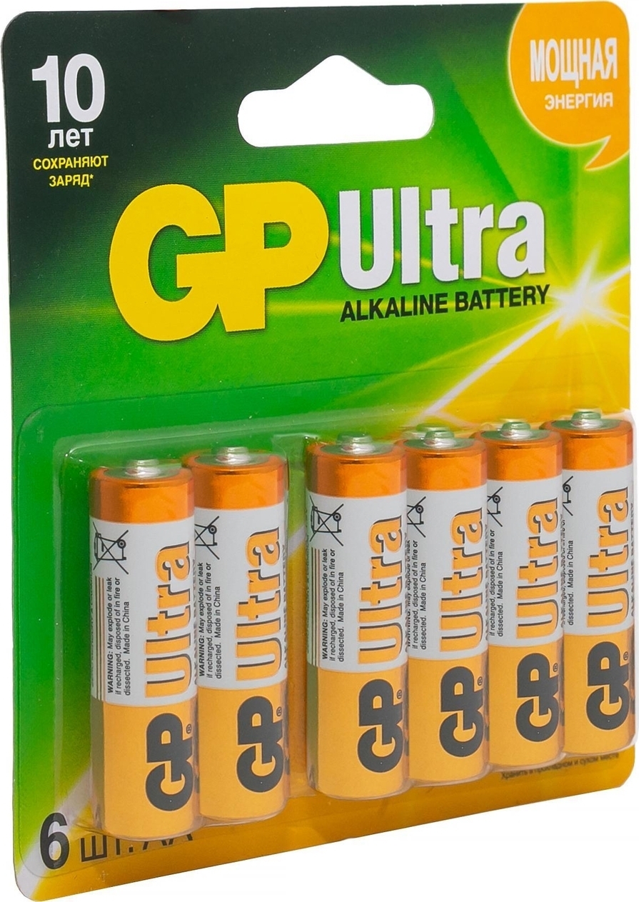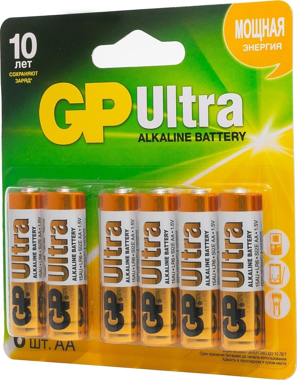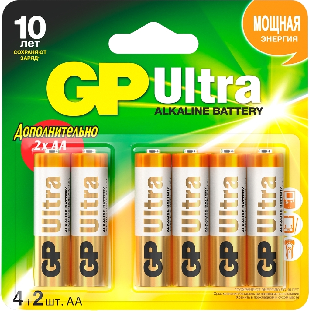 Батарейки щелочные (алкалиновые) GP Ultra, тип AA, 1.5V, 6шт. (Пальчиковые)