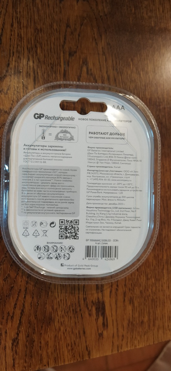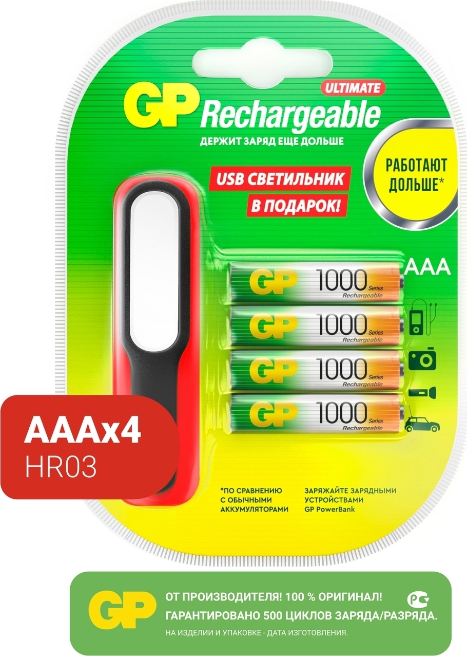Аккумулятор GP, Ni-Mh, тип AAA, 1000 mAh, + USB-светильник (GP 100AAAHC/USBLED-2CR4), 1.2V, 4 шт