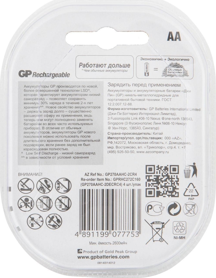Аккумулятор GP, Ni-Mh, тип AA, 2700 mAh (GP 270AAHC-2DECRC4), 1.2V, 4 шт
