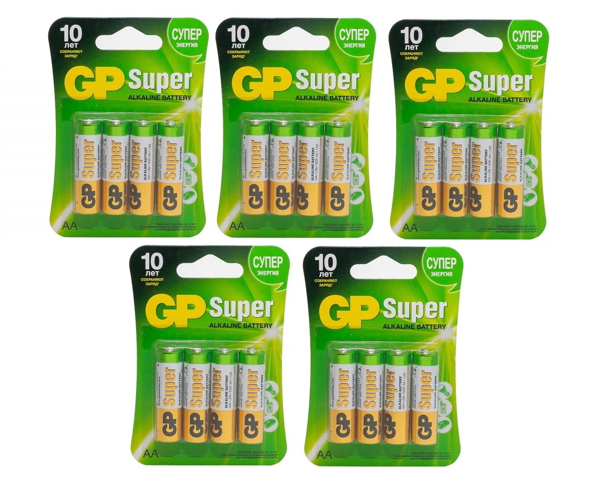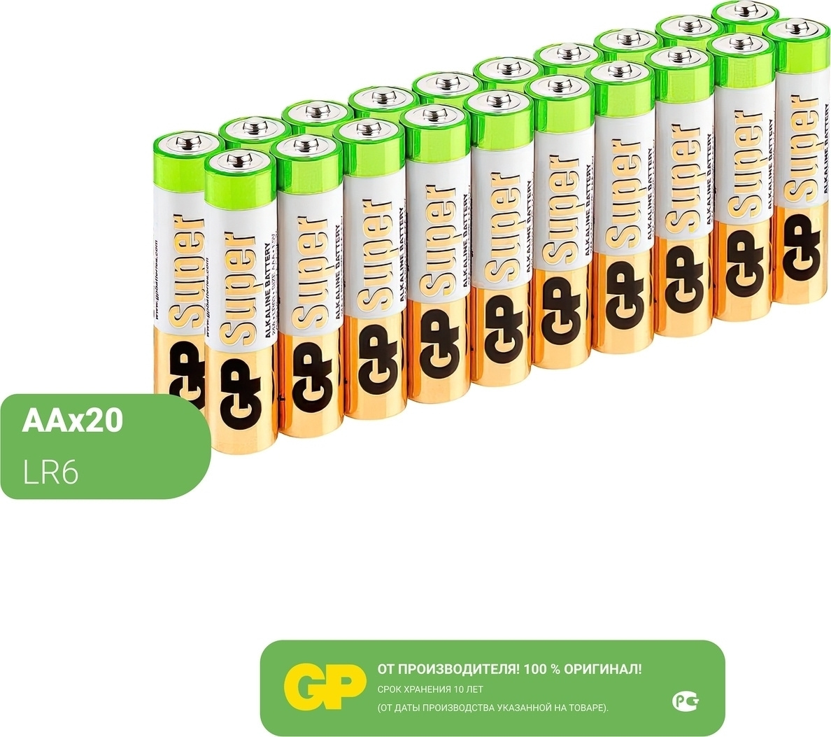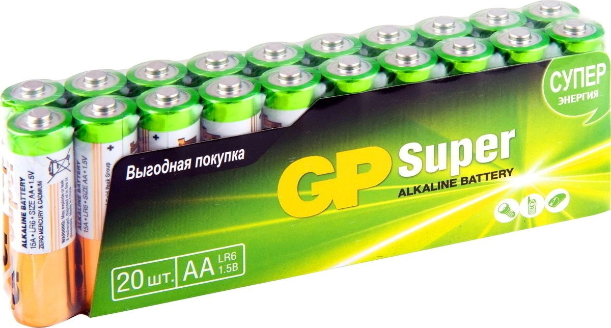 Батарейки щелочные (алкалиновые) GP Super, тип AA, 1.5V, 20шт (Пальчиковые)