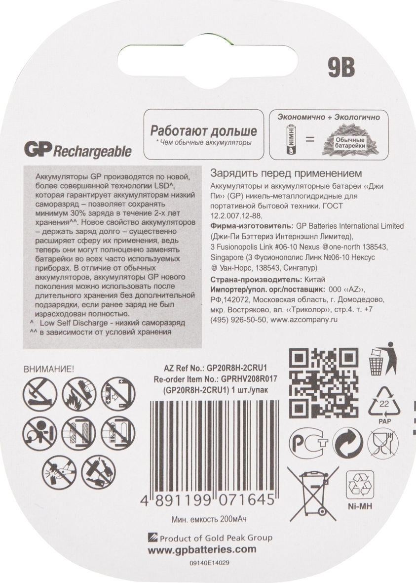 Аккумулятор 2200 мА·ч GP Rechargeable 2200 Series C