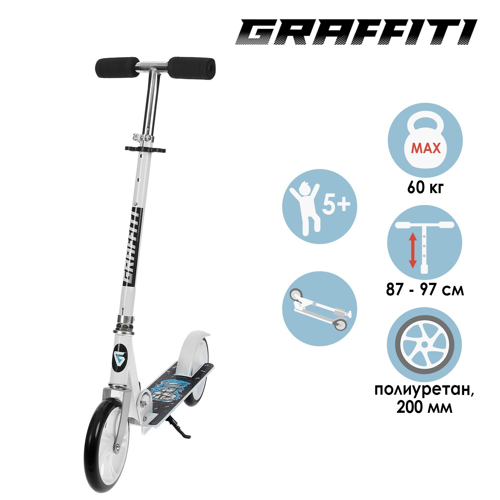 Самокат GRAFFITI, складной, колёса PU, диаметр 200 мм, ABEC 9, цвет белый