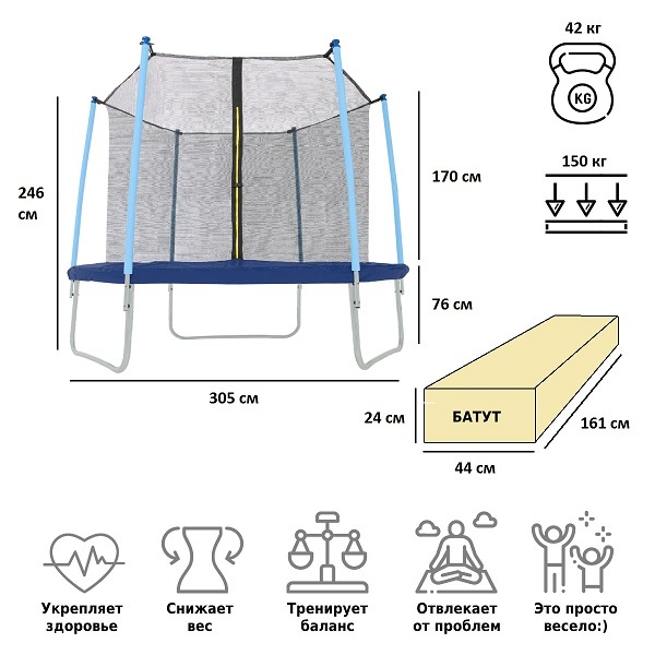 Батут каркасный Green Glade B7102 с сеткой 10-футовый 3 ножки 6 стоек, до 150 кг, диаметр 305 см