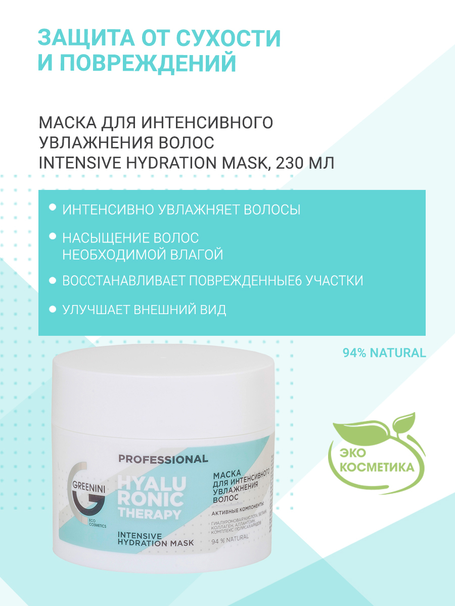 Greenini PROFESSIONAL Маска для интенсивного увлажнения волос HYALURONIC THERAPHY, 230мл