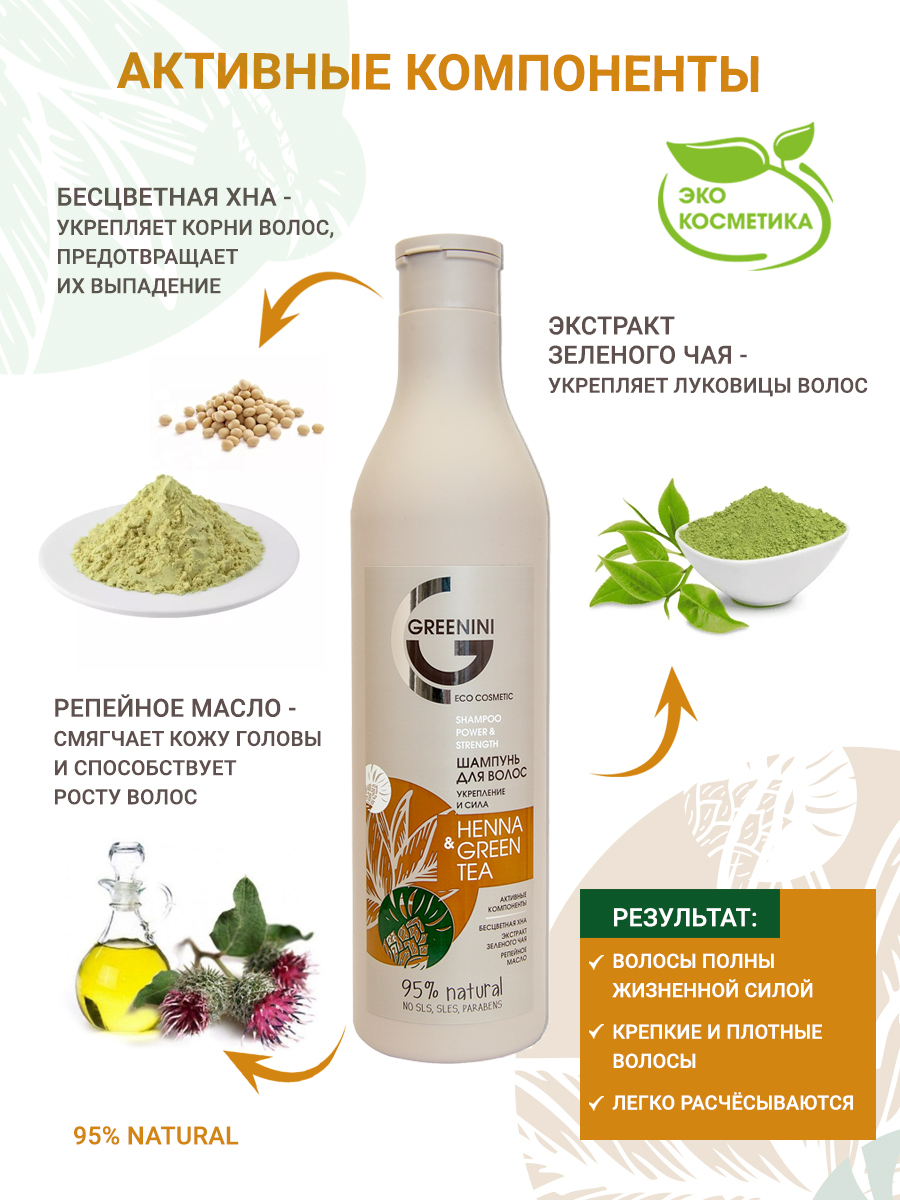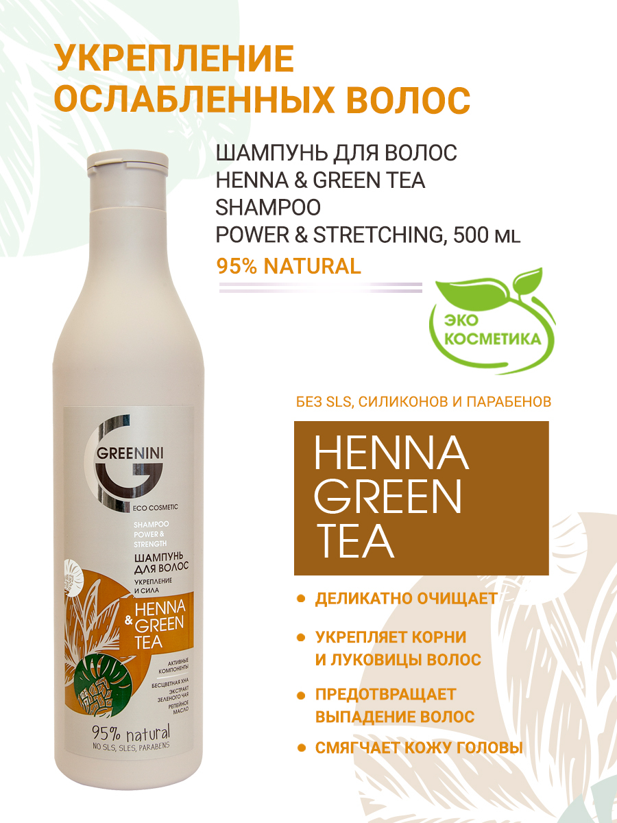 Greenini Шампунь для волос Укрепление и сила Henna & Green Tea 500 мл