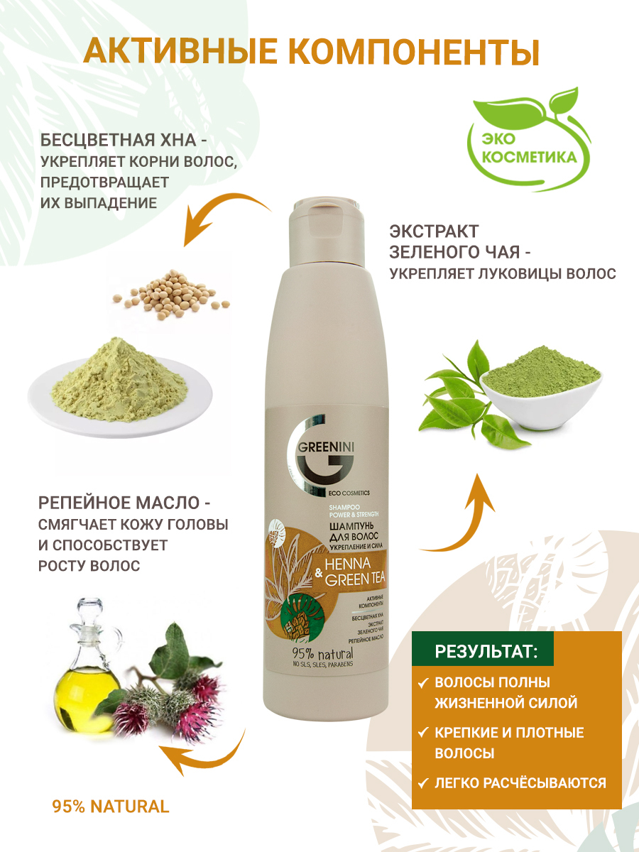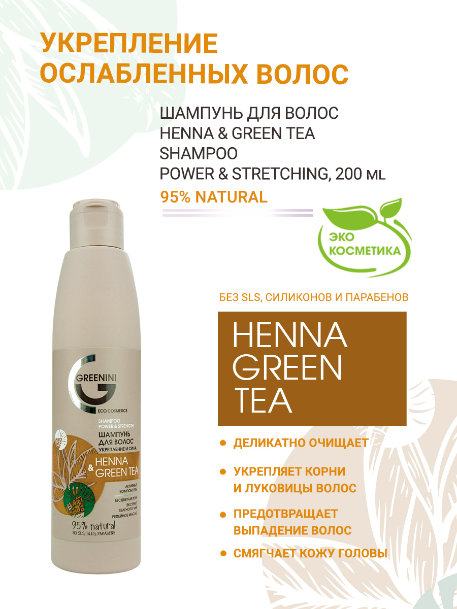 Greenini Шампунь для волос Укрепление и сила Henna & Green Tea 200 мл