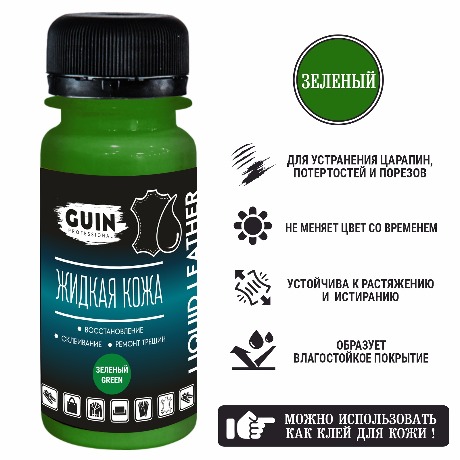 Жидкая кожа клей Guin зеленая 50 мл для ремонта кожаных изделий, восстановитель кожи