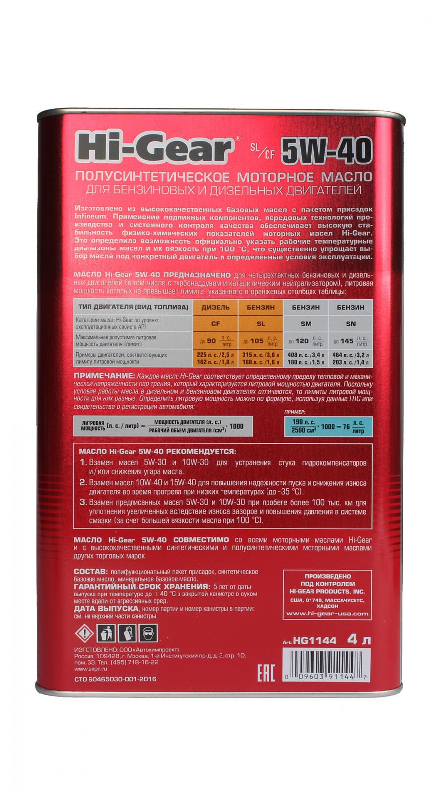 Моторное масло Hi-Gear MOTOR OIL SAE API SL/CF 5W-40 Полусинтетическое 4 л