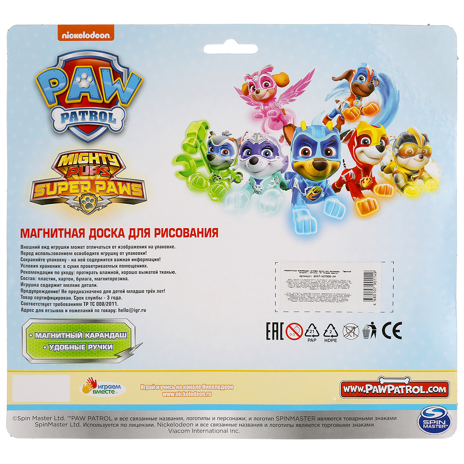 Доска для рисования Играем вместе Щенячий патруль магнитная, 20х15см, чёрно-белое поле