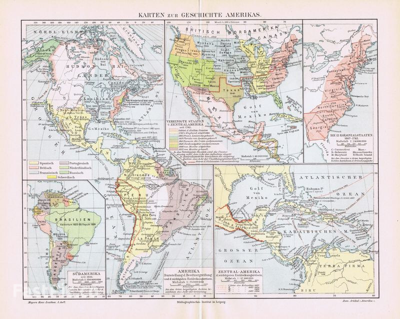 Географическая карта антикварная. История Америки. Смешанная техника. Германия, Лейпциг, 1896 год