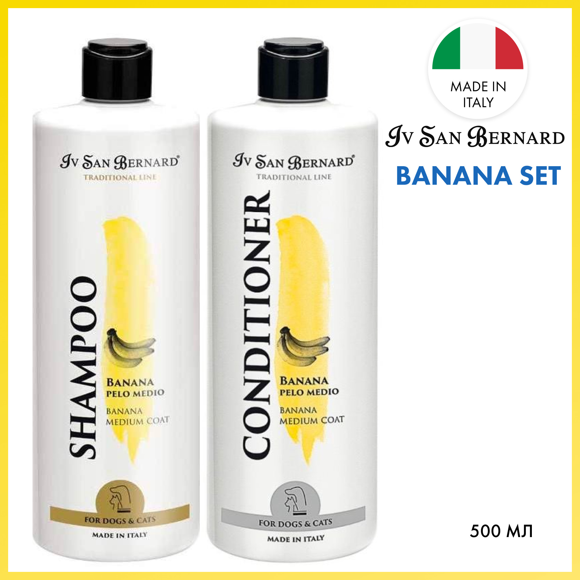 Выгодный набор шампунь для собак для шерсти средней длины 0,5L и кондиционер 0,5L ISB TRADITIONAL LINE BANANA, Iv San Bernard Италия, спелый банан