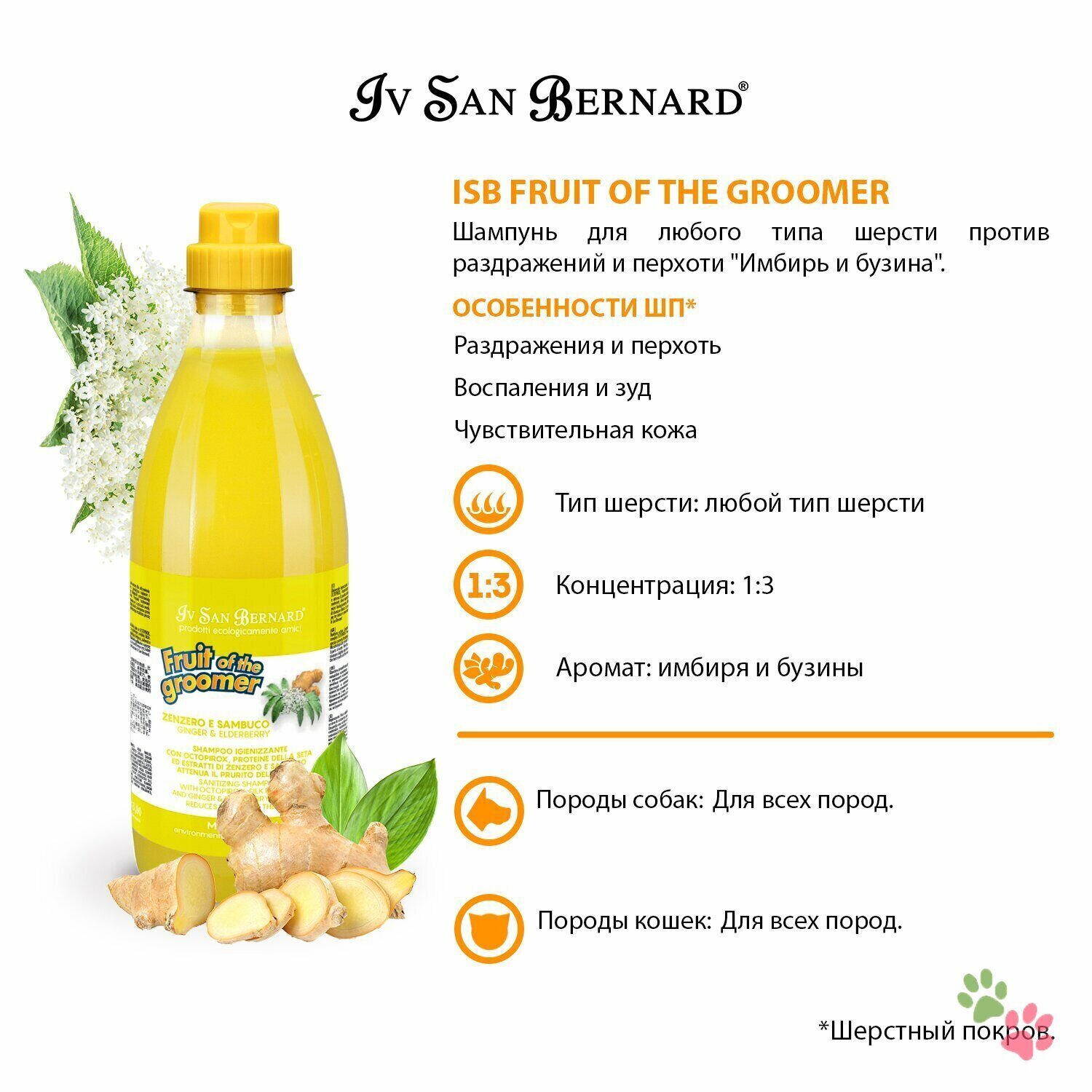 Iv San Bernard ISB (Ив Сан Бернард) Fruit of the Groomer Ginger&Elderbery Шампунь для любого типа шерсти против раздражений и перхоти 500мл