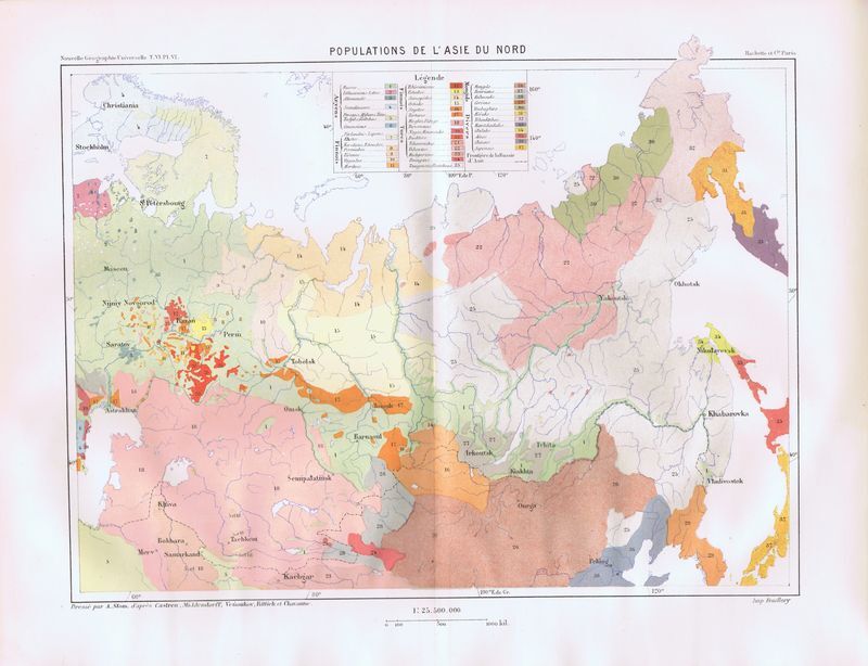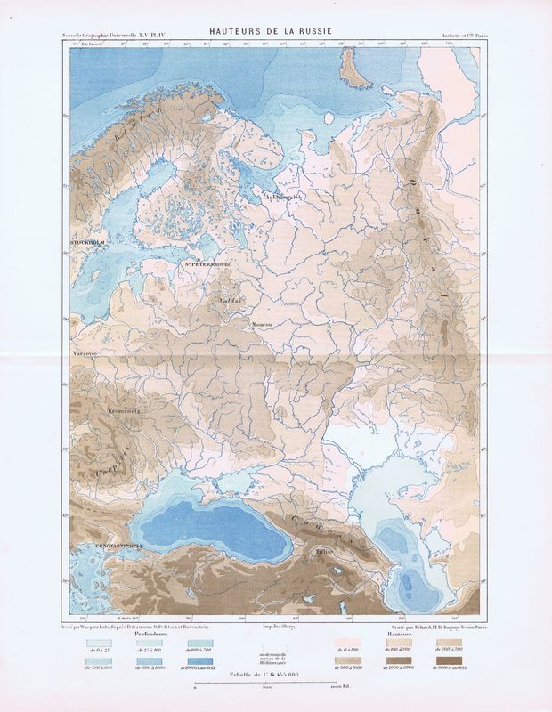 Географическая карта антикварная. Рельеф России. Литография. Франция, Париж, 1880 год