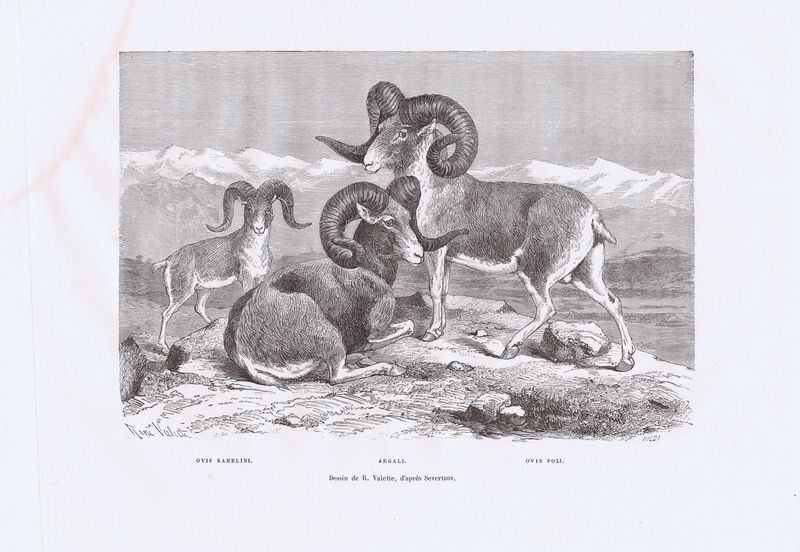 Гравюра антикварная. Горные бараны (архары, аргали). Ксилография. Франция, Париж, 1881 г.