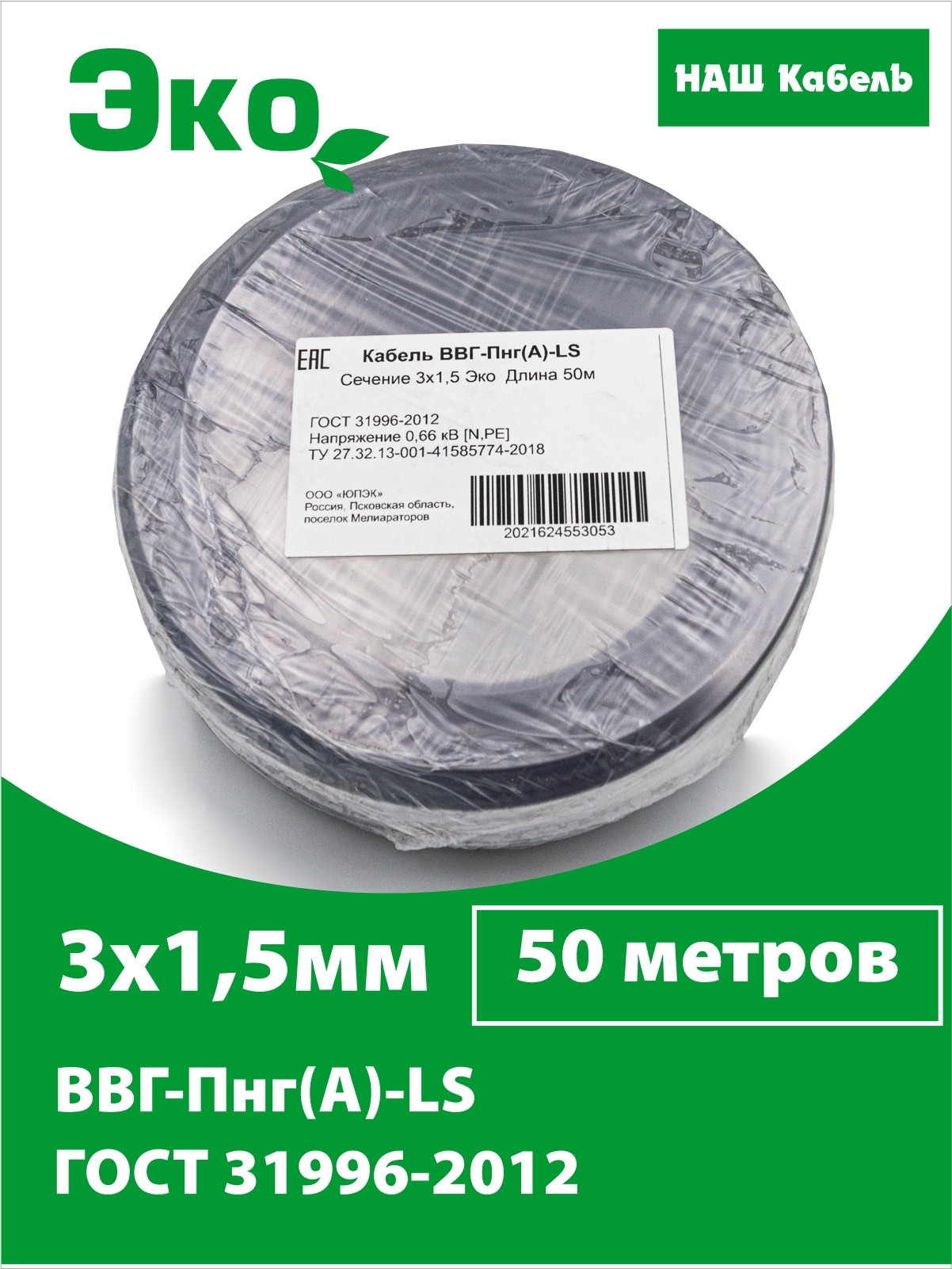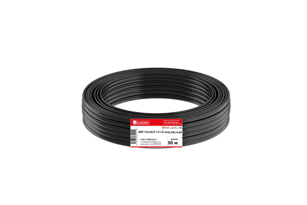 Электрический кабель Кабэкс ВВГ-Пнг(А)-LS 3 x 1,5 мм², 50 м