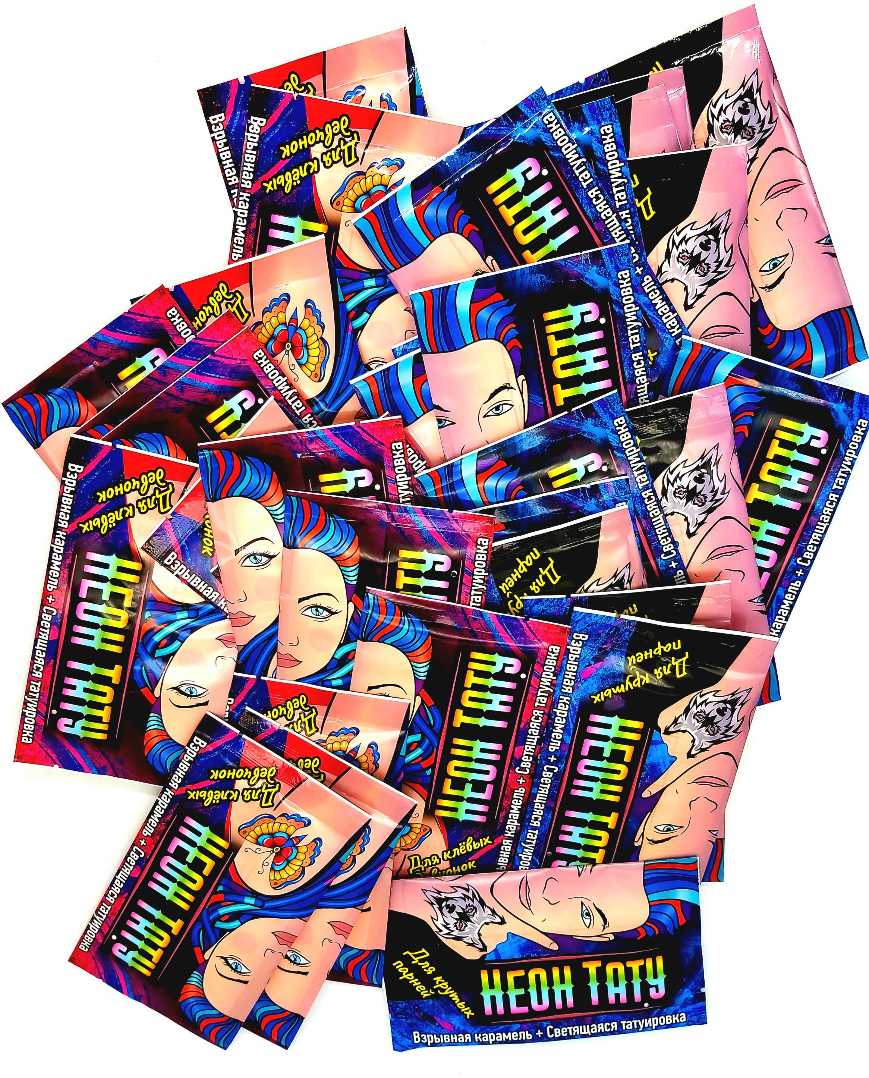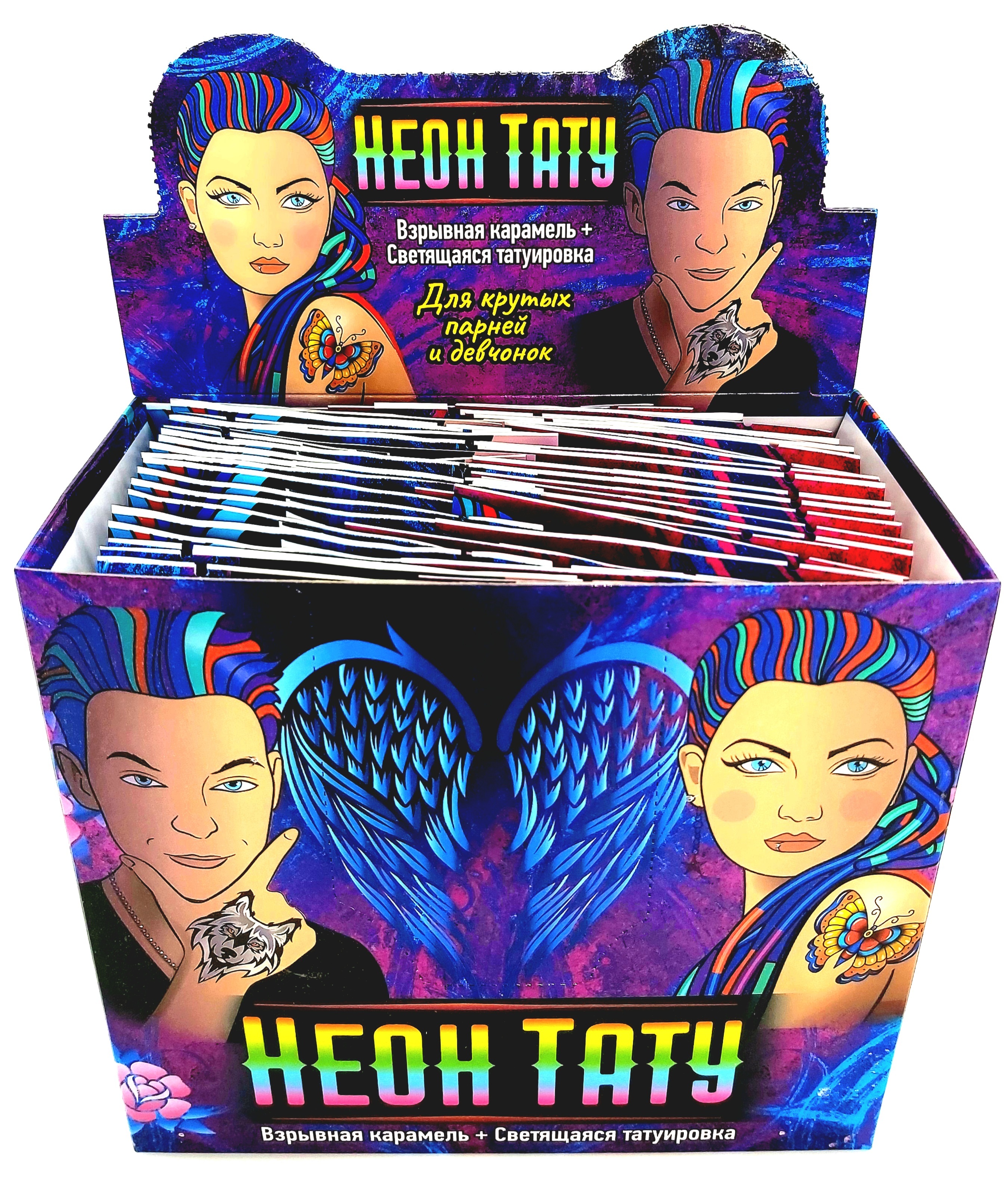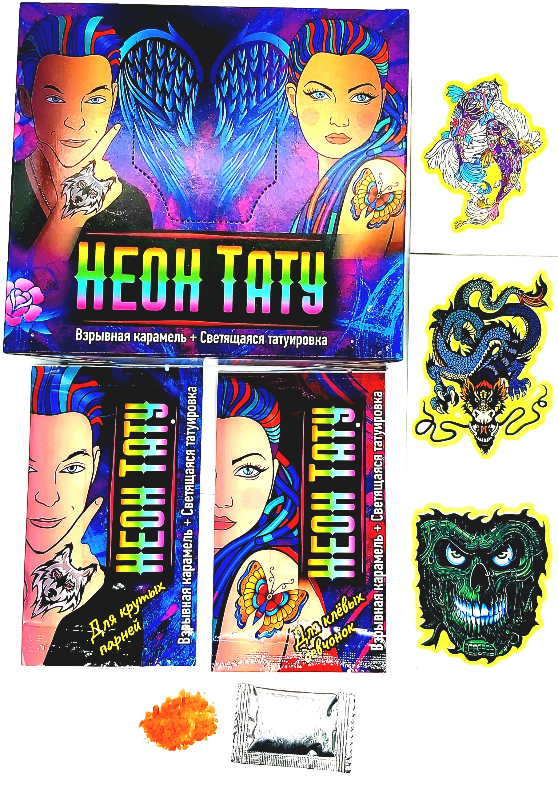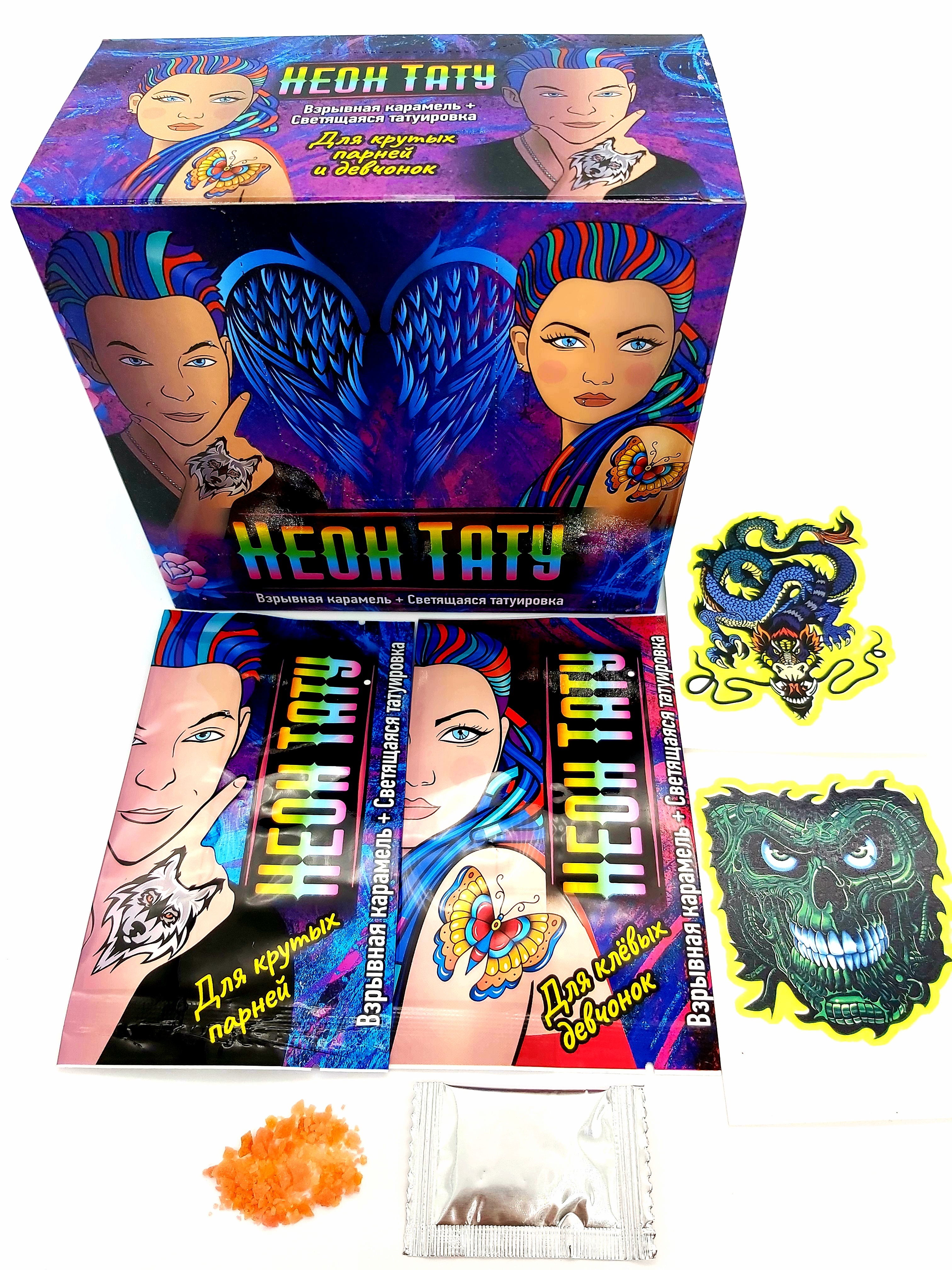 Карамель взрывная шипучка НЕОН ТАТУ светящаяся татуировка, хлопающая карамель блок /48, Канди Клаб