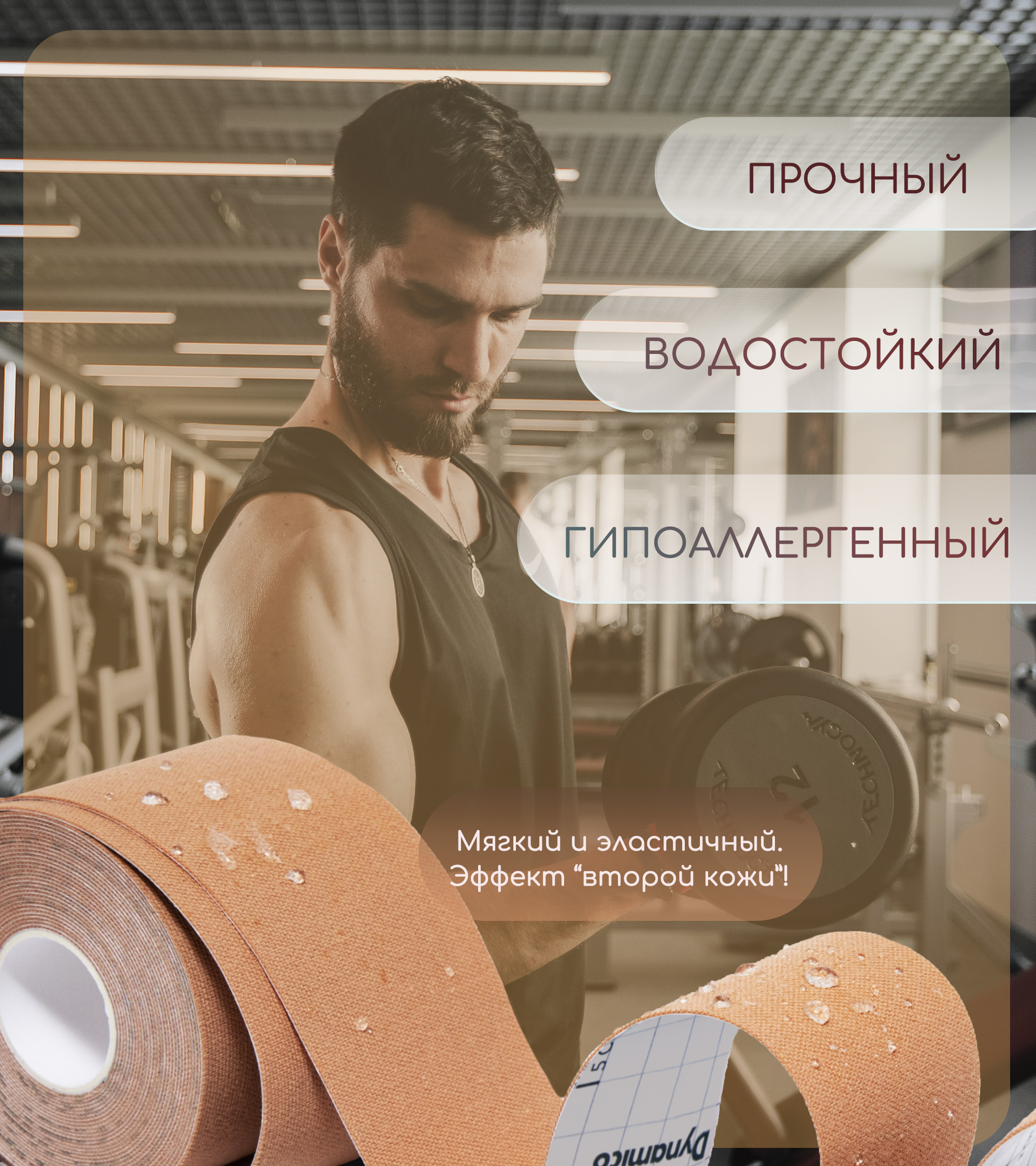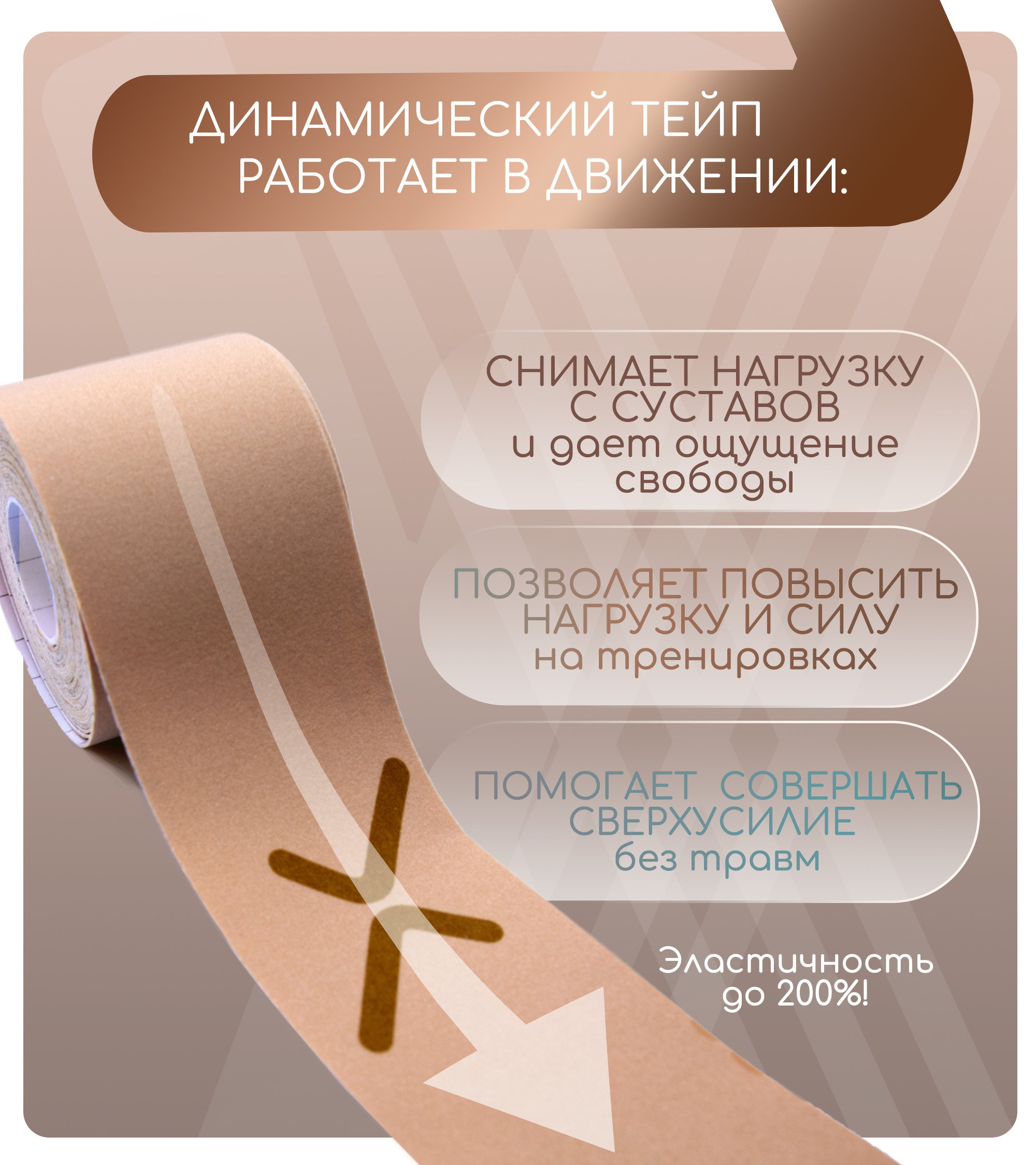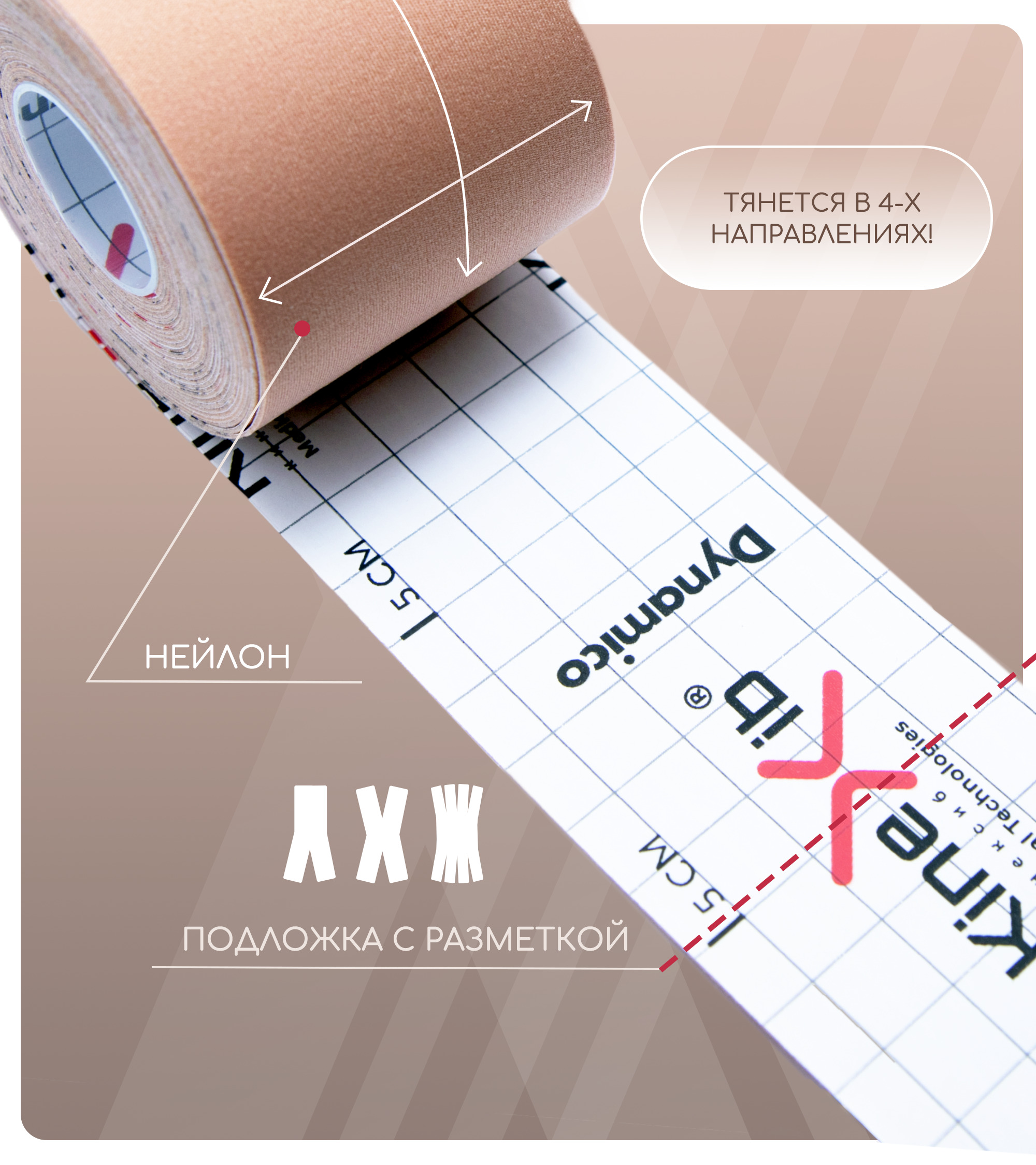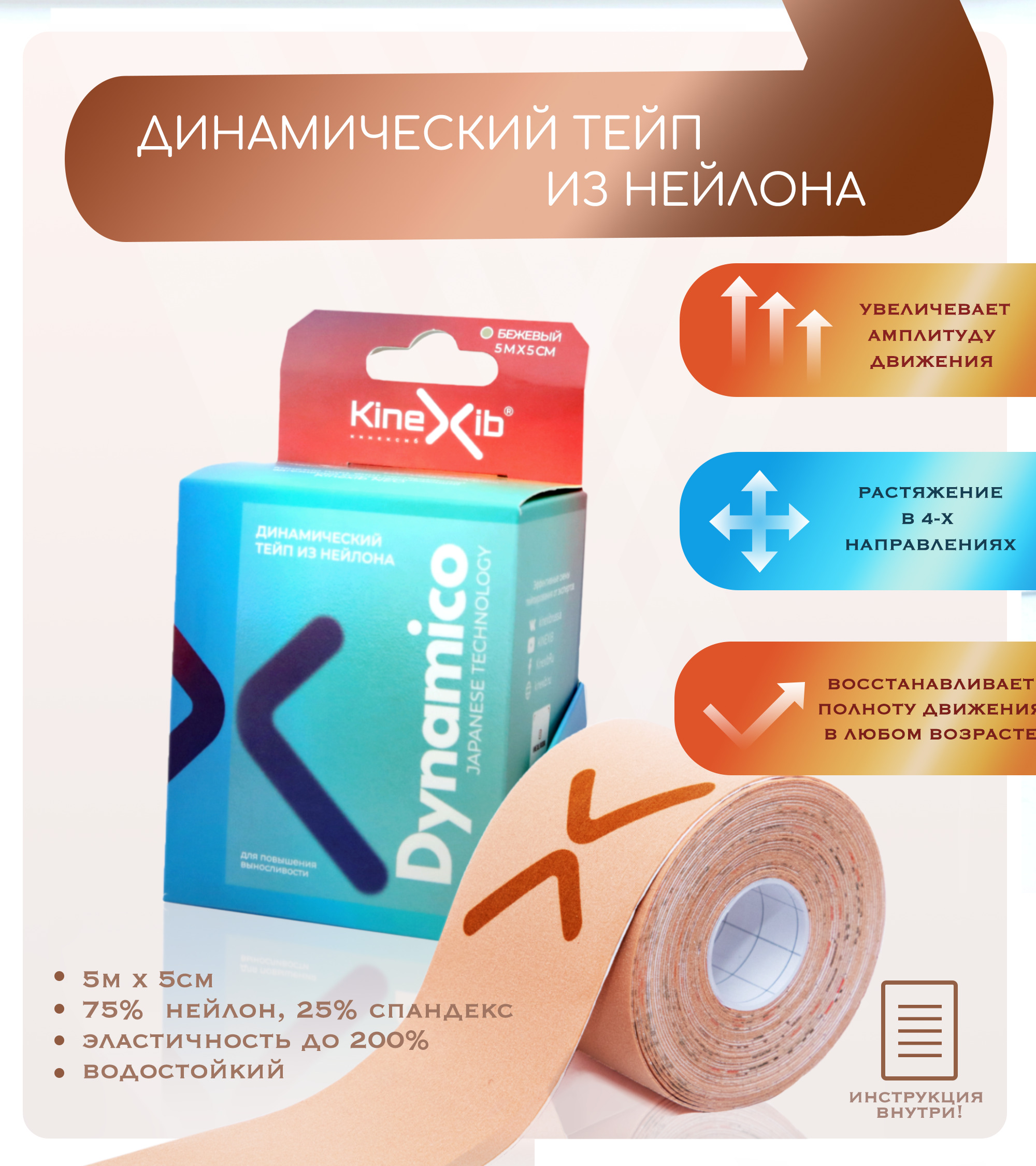 Кинезиотейп Kinexib Dynamico для спорта, эластичность 200% 5см Х 5 м, бежевый