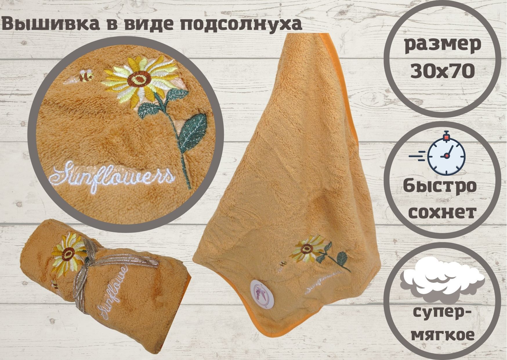 Гостевое полотенце, Полотенце для ванной Koloco Подсолнух Микрофибра 30x70 см, 1 шт.