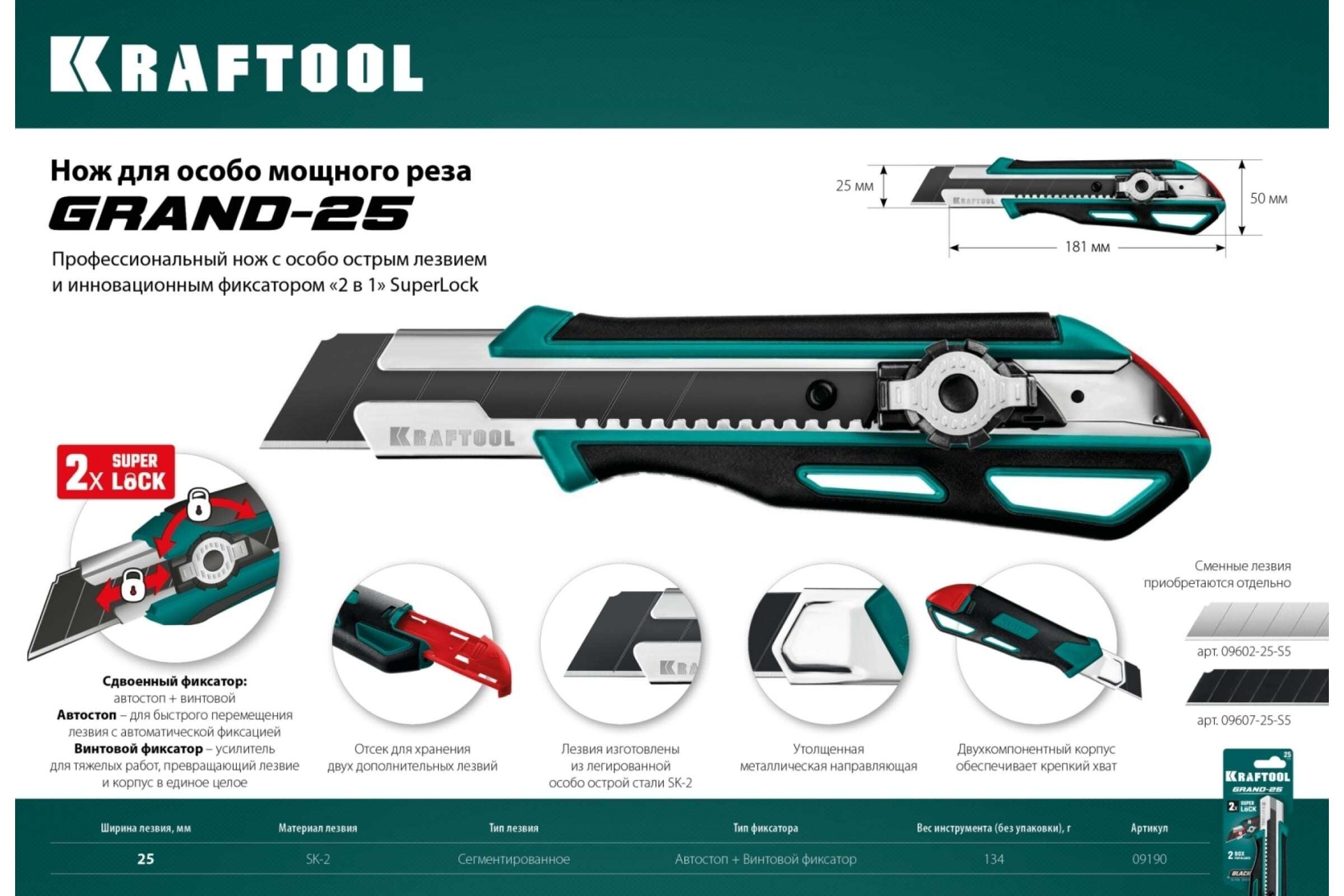 Нож KRAFTOOL GRAND-25 с двойным фиксатором, сегментированные лезвия 25 мм 09190