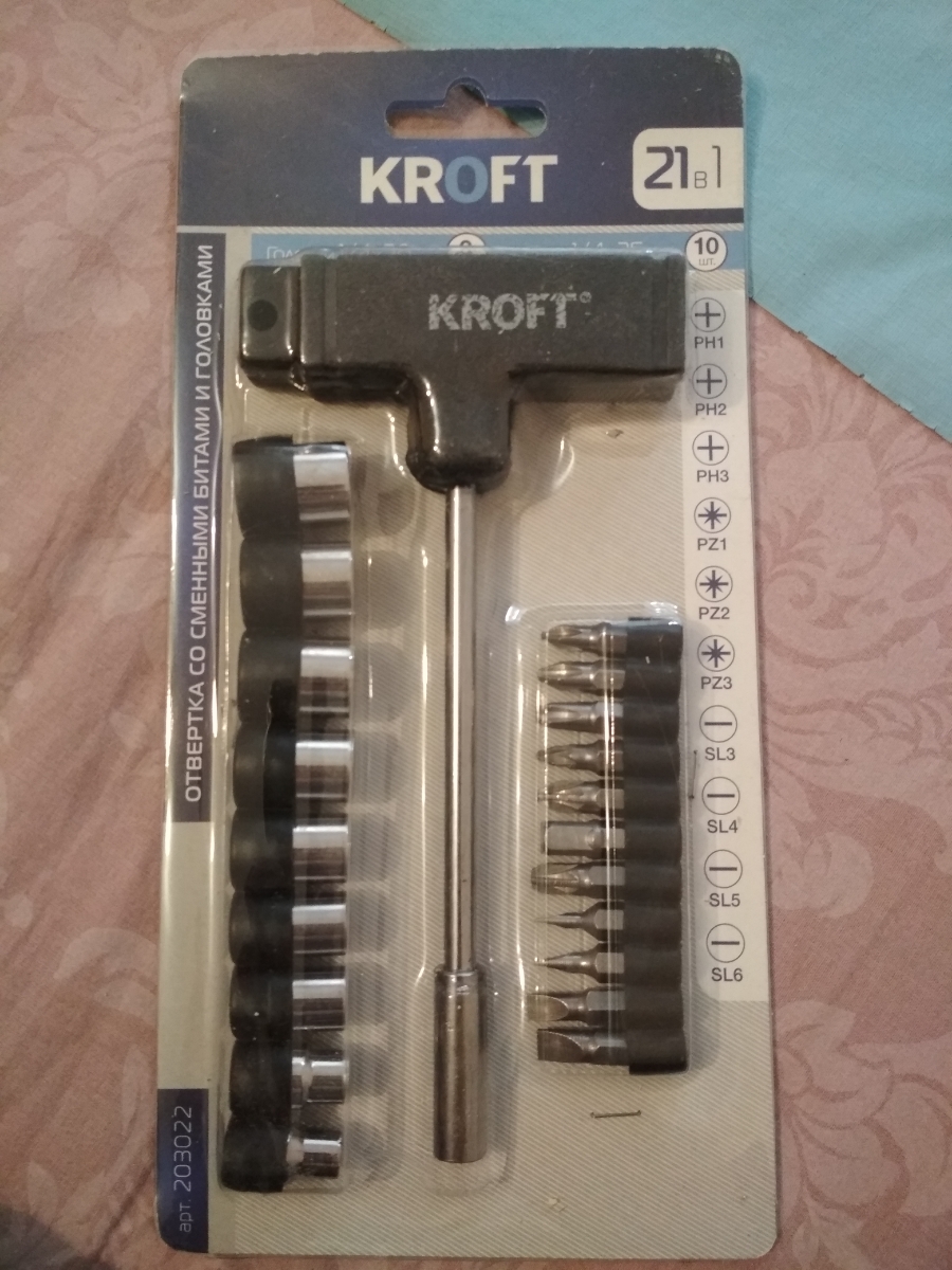 Набор головок и бит "Kroft", Т-образная ручка, 21 предмет
