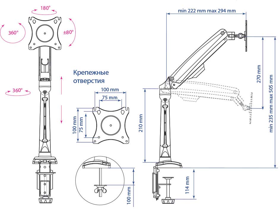 Кронштейн для мониторов ЖК Kromax OFFICE-1 темно-серый 15"-32" макс.10кг настольный поворот и наклон