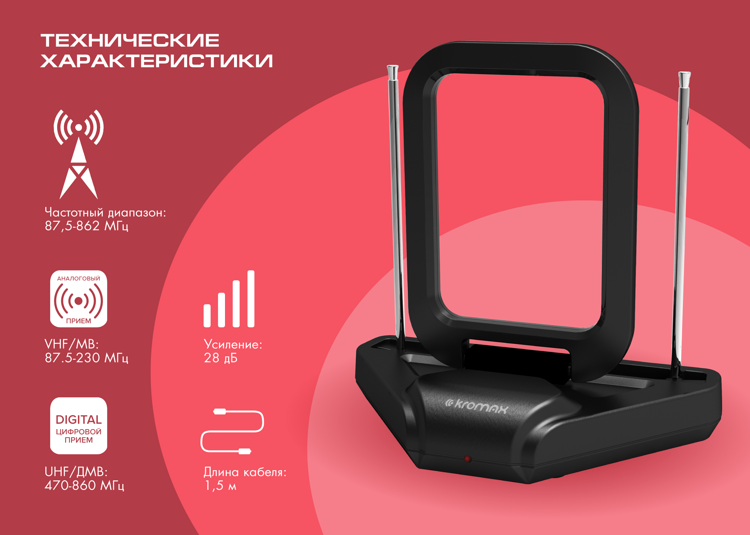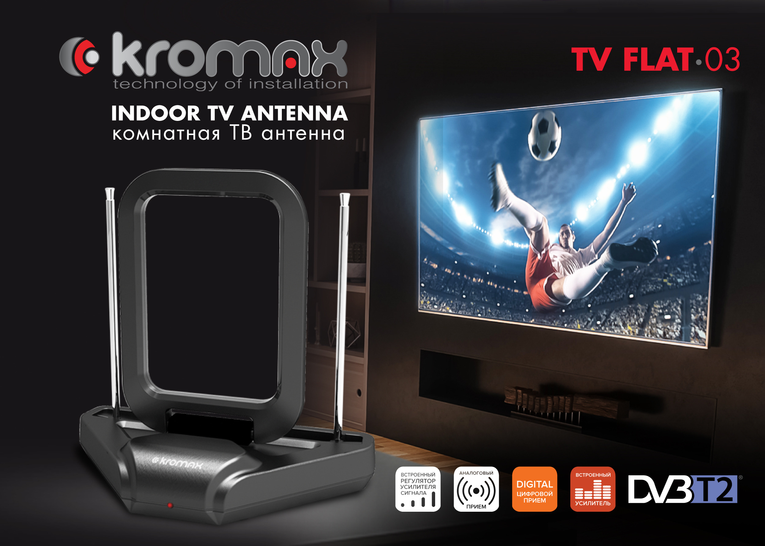 Антенна для цифрового тв телевизионная комнатная активная KROMAX TV FLAT-03, поддержка DVB-T2