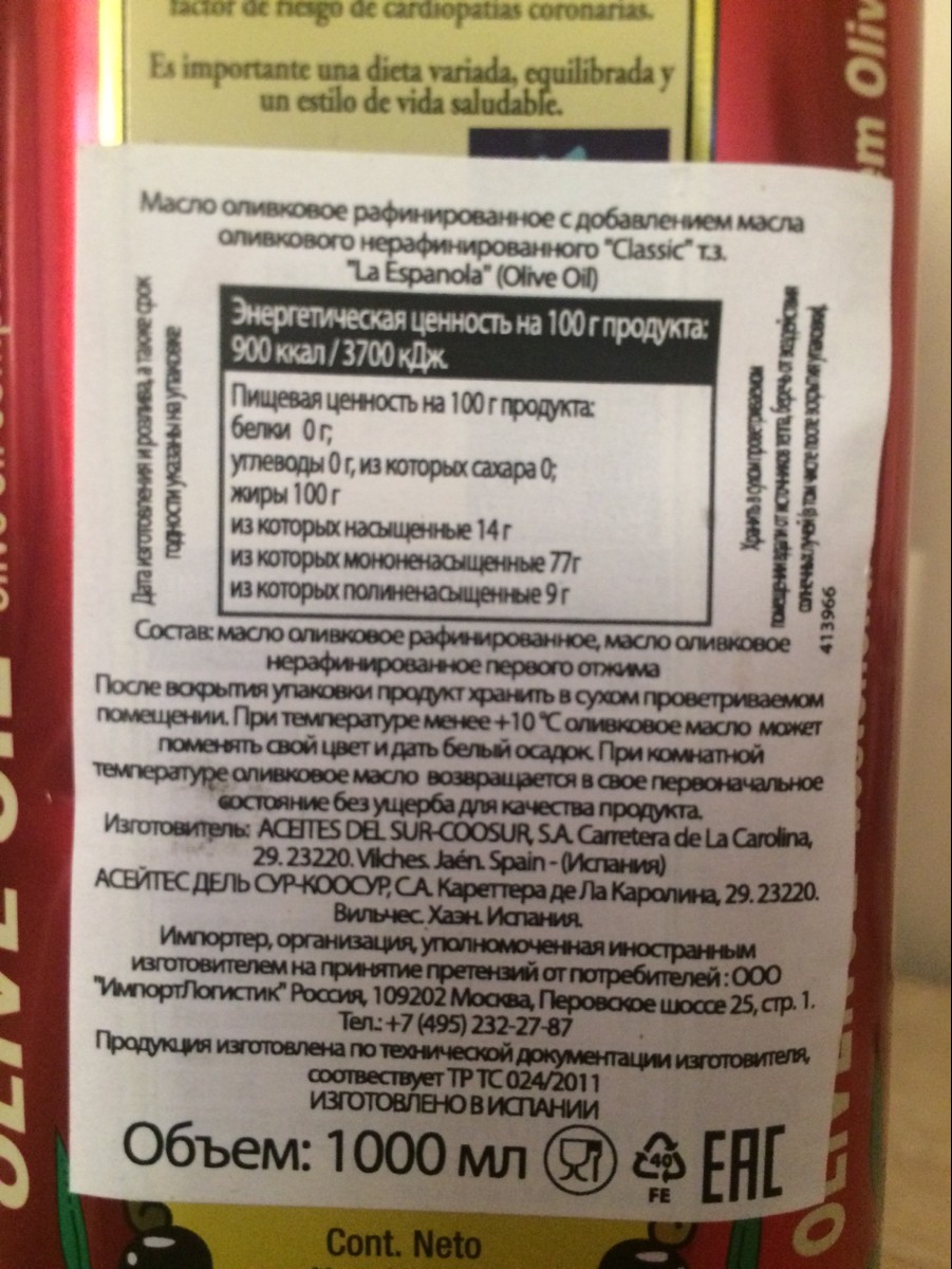 Оливковое масло Olive Oil Classic La Espanola, рафинированное с добавлением нерафинированного, 1 л