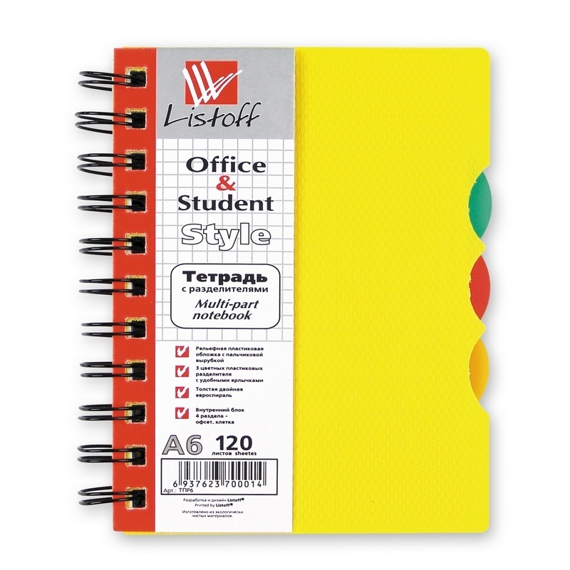 Блокнот Listoff А6, 120 листов, спираль, пластик с разделителями