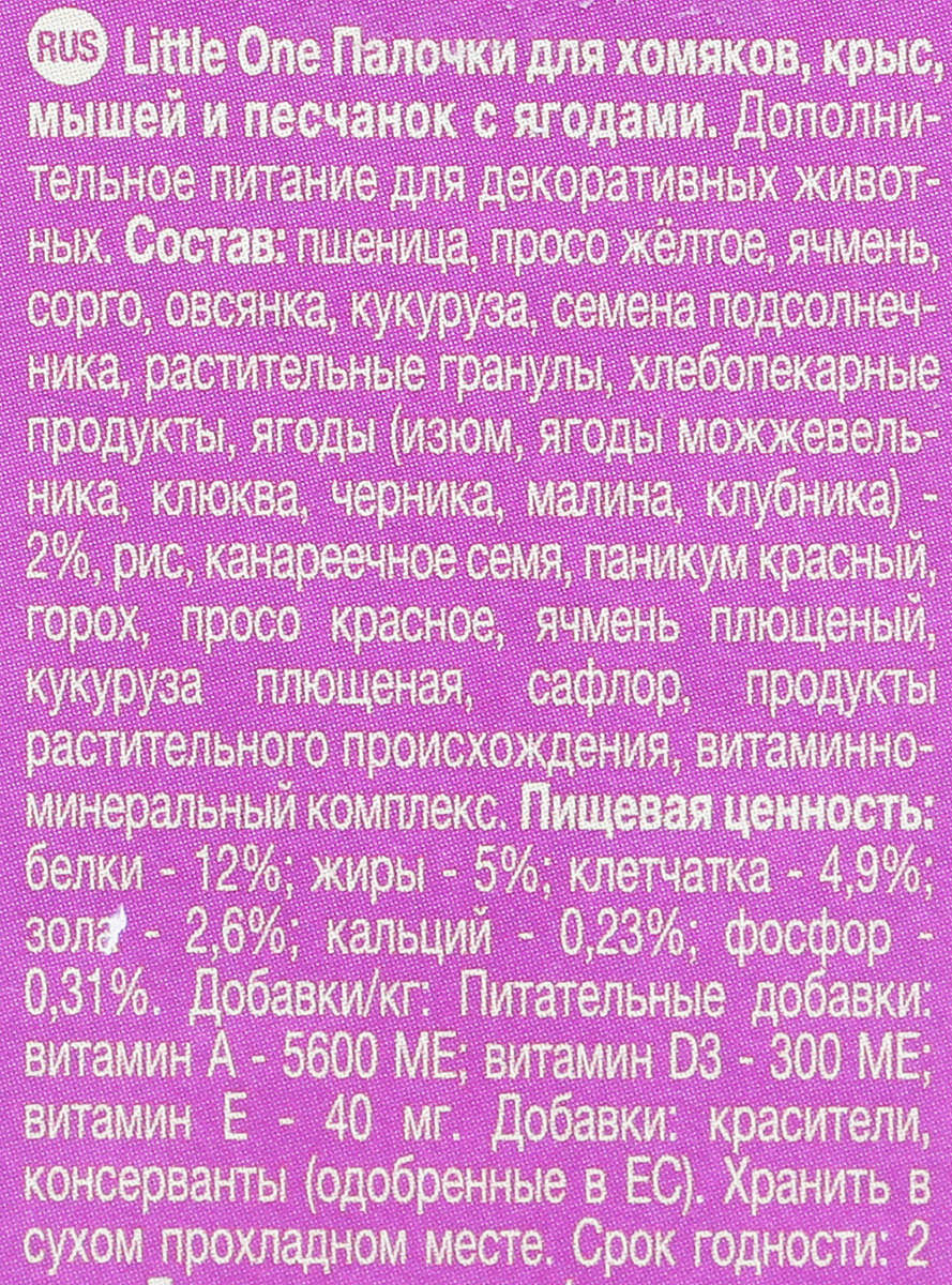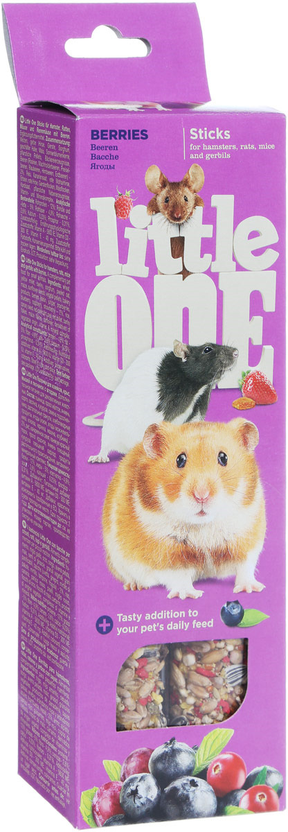 Лакомство для хомяков, крыс, мышей и песчанок Little One "Sticks", с ягодами, 2 х 60 г