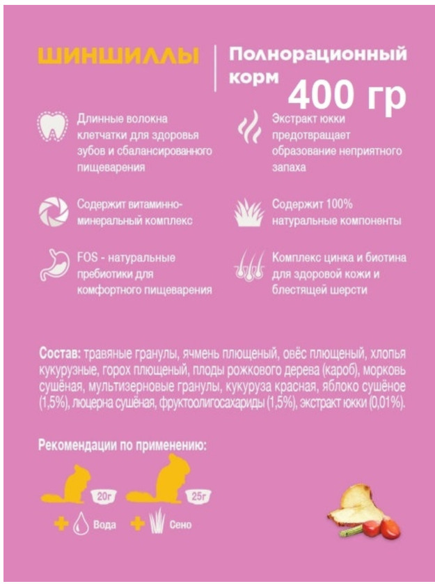 Сухой корм для шиншилл / смесь кормовая зерновая для грызунов little one 400г