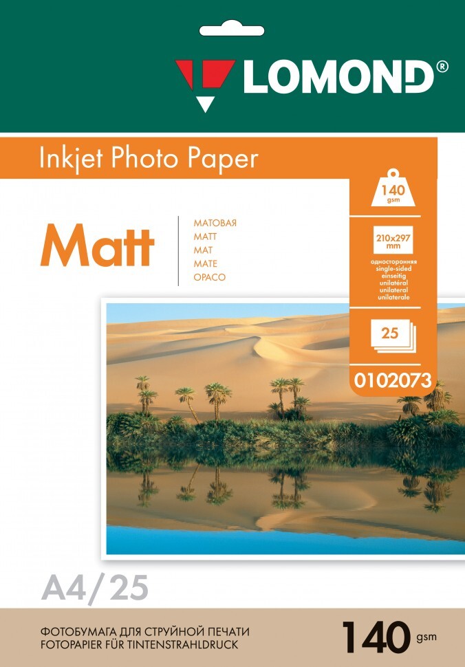 Фотобумага А4, 140 г/м2, 25 листов, матовая, односторонняя, Lomond 0102073
