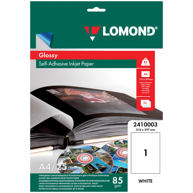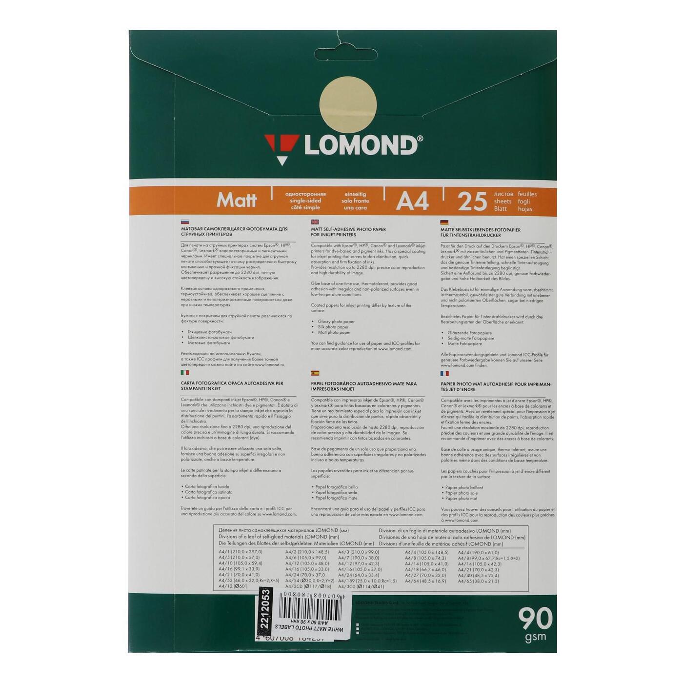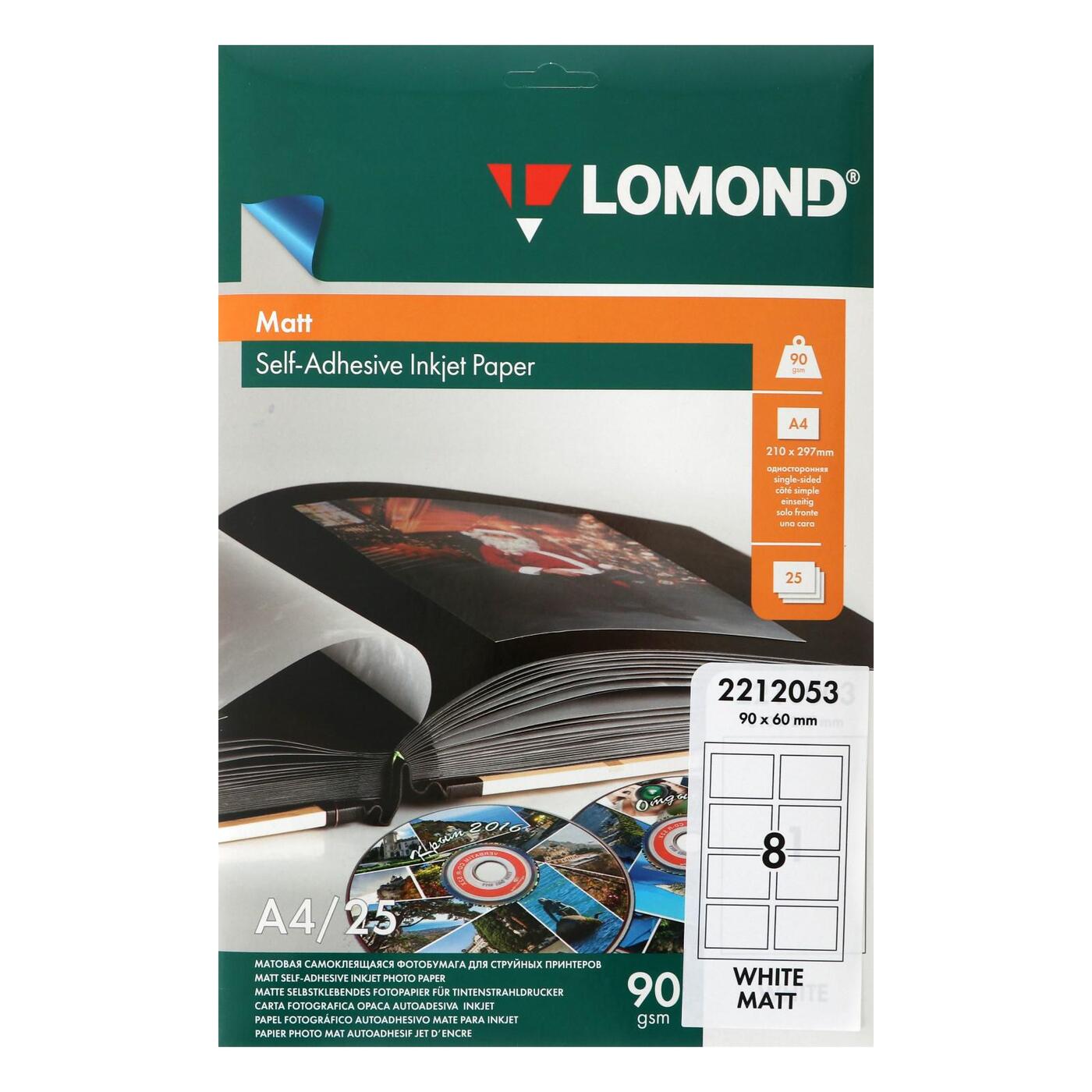 Бумага самоклеящаяся А4 25л. Lomond, белая, неделенная, глянцевая, 85г/м2