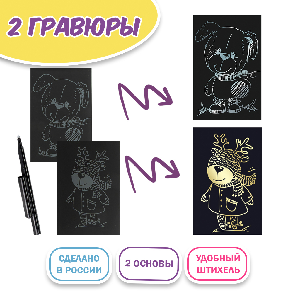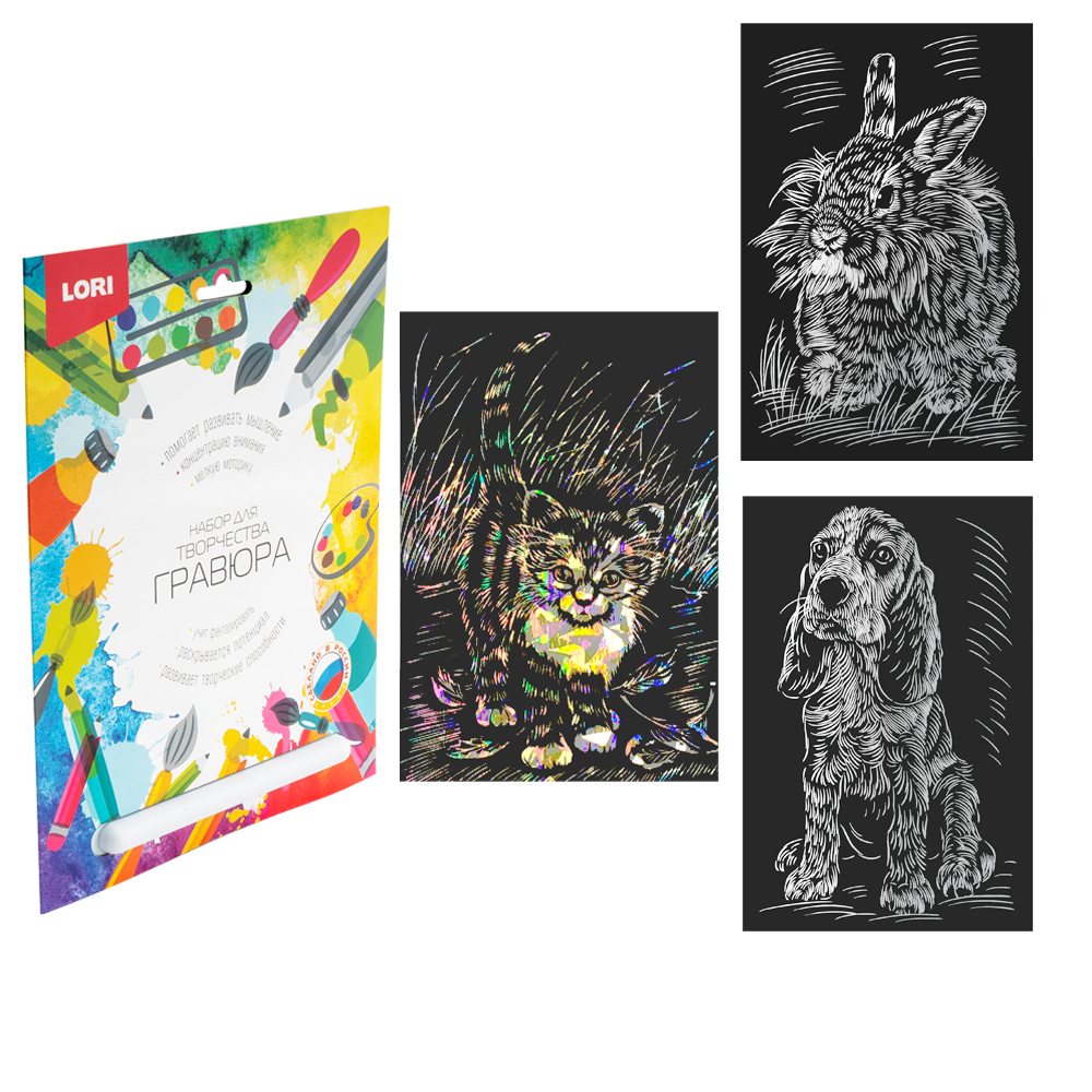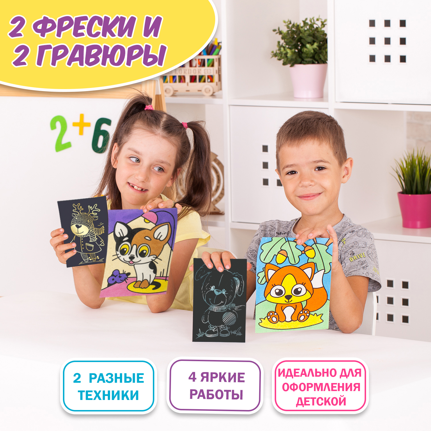 Набор для творчества LORI 2 картины из песка и 2 гравюры Мультяшные зверята, 4 шт. в наборе