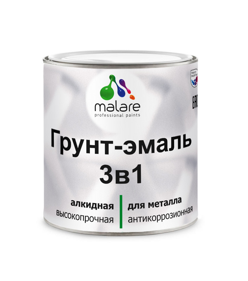 Грунт-эмаль, Краска Malare Антикоррозионная 3 в 1 Быстросохнущая, Акриловая, Глянцевое покрытие, 2 кг, светло-серый