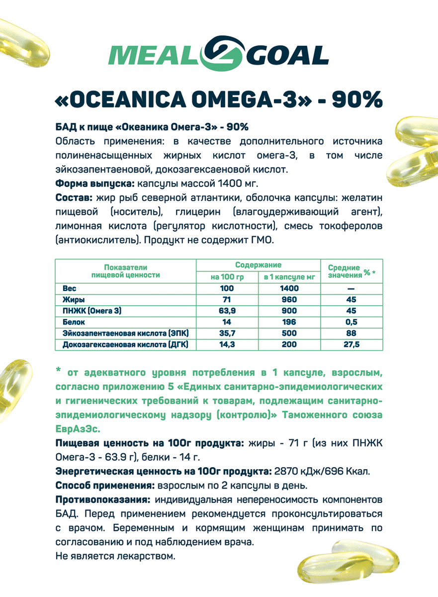 БАД к пище, Meal2Goal, "Океаника Омега-3" 90%, 1400 мг, 500 капсул
