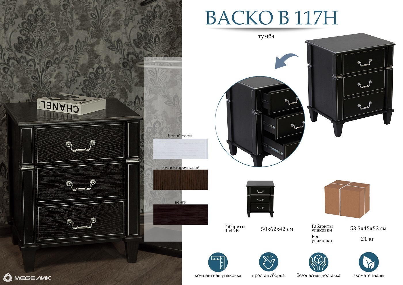 Тумба прикроватная Мебелик Васко В 117Н, 3 ящ., 50х42х62 см