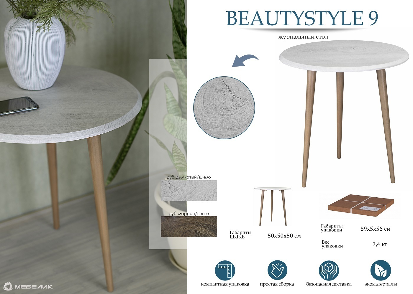 Журнальный стол, Приставной столик Мебелик BeautyStyle 9 дуб дымчатый/шимо, 50х50х50 см