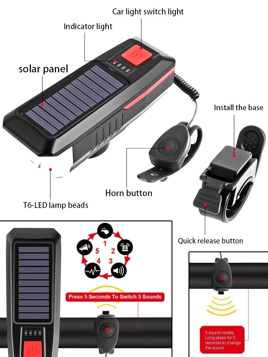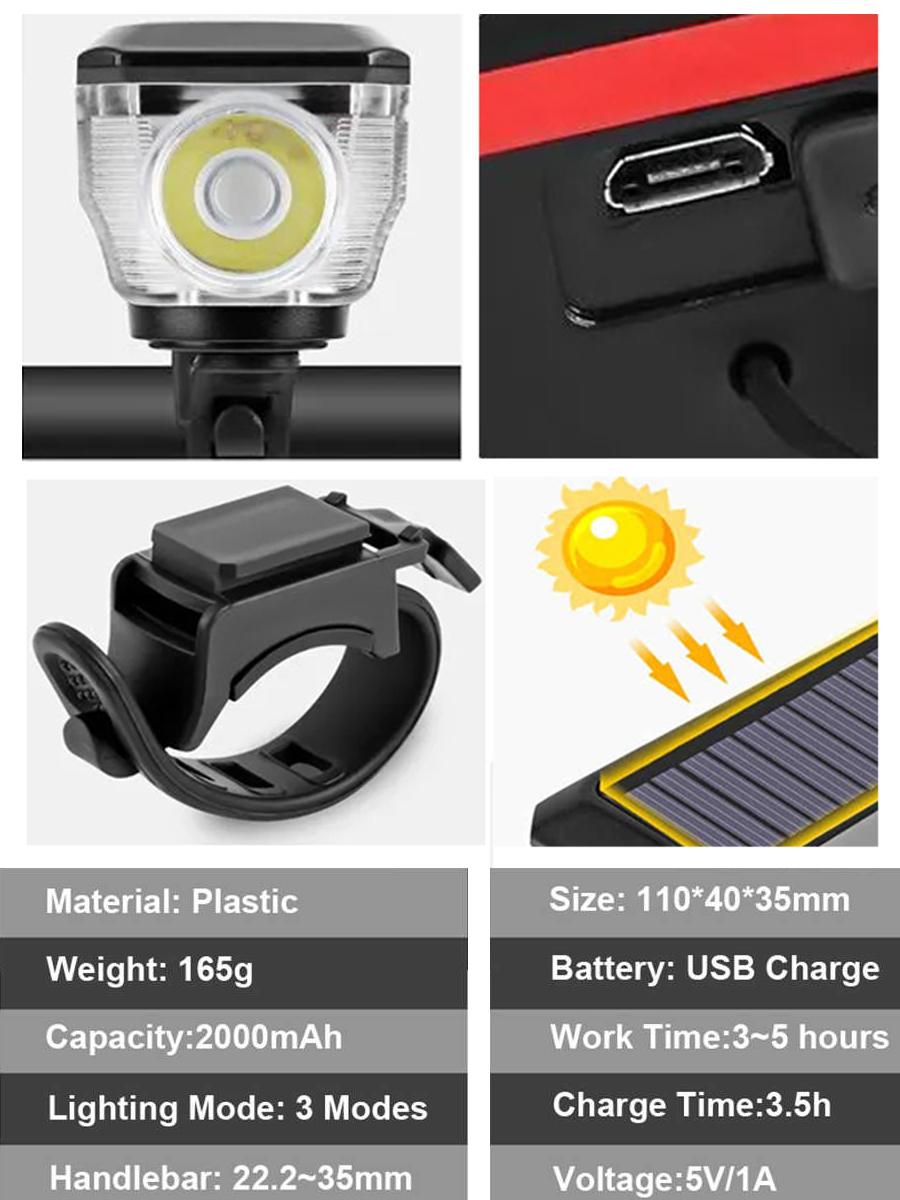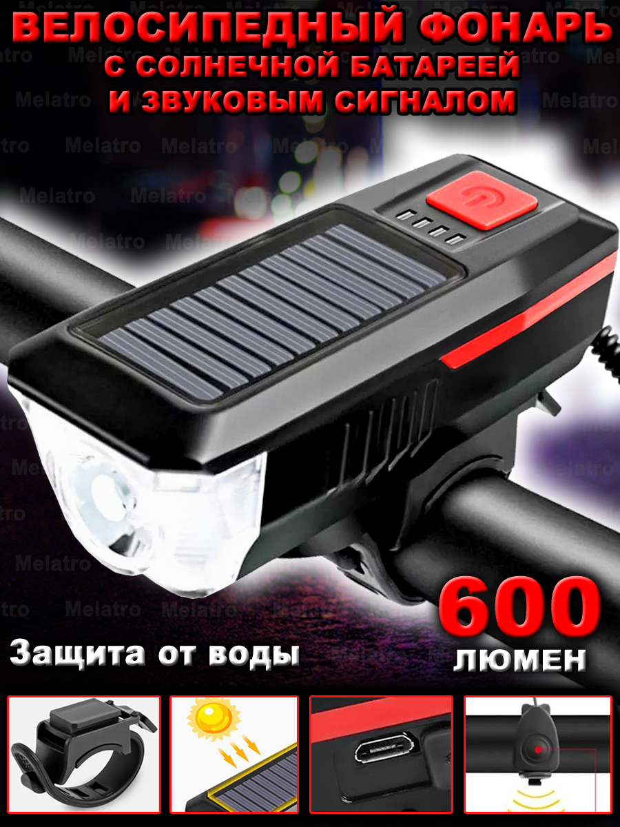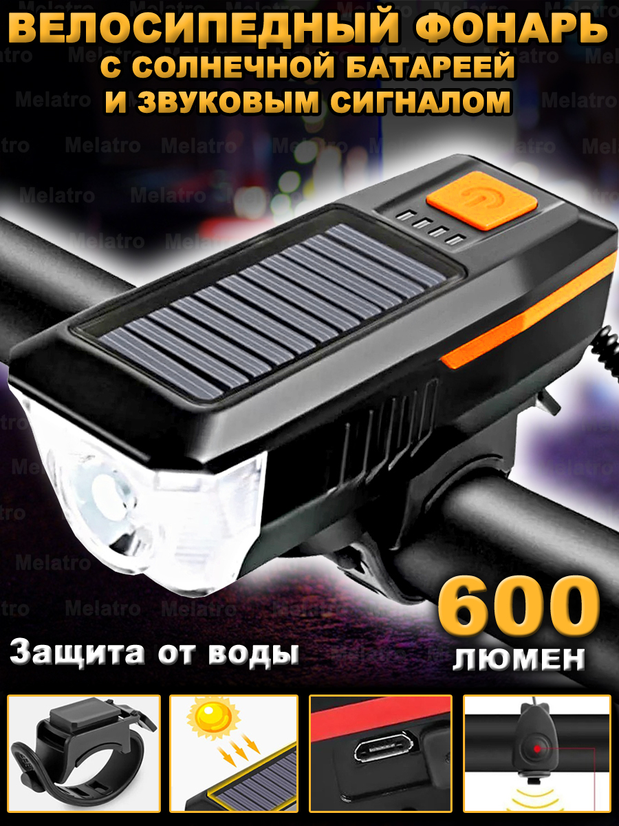 Велосипедный светодиодный фонарь с солнечной батареей и встроенным аккумулятором