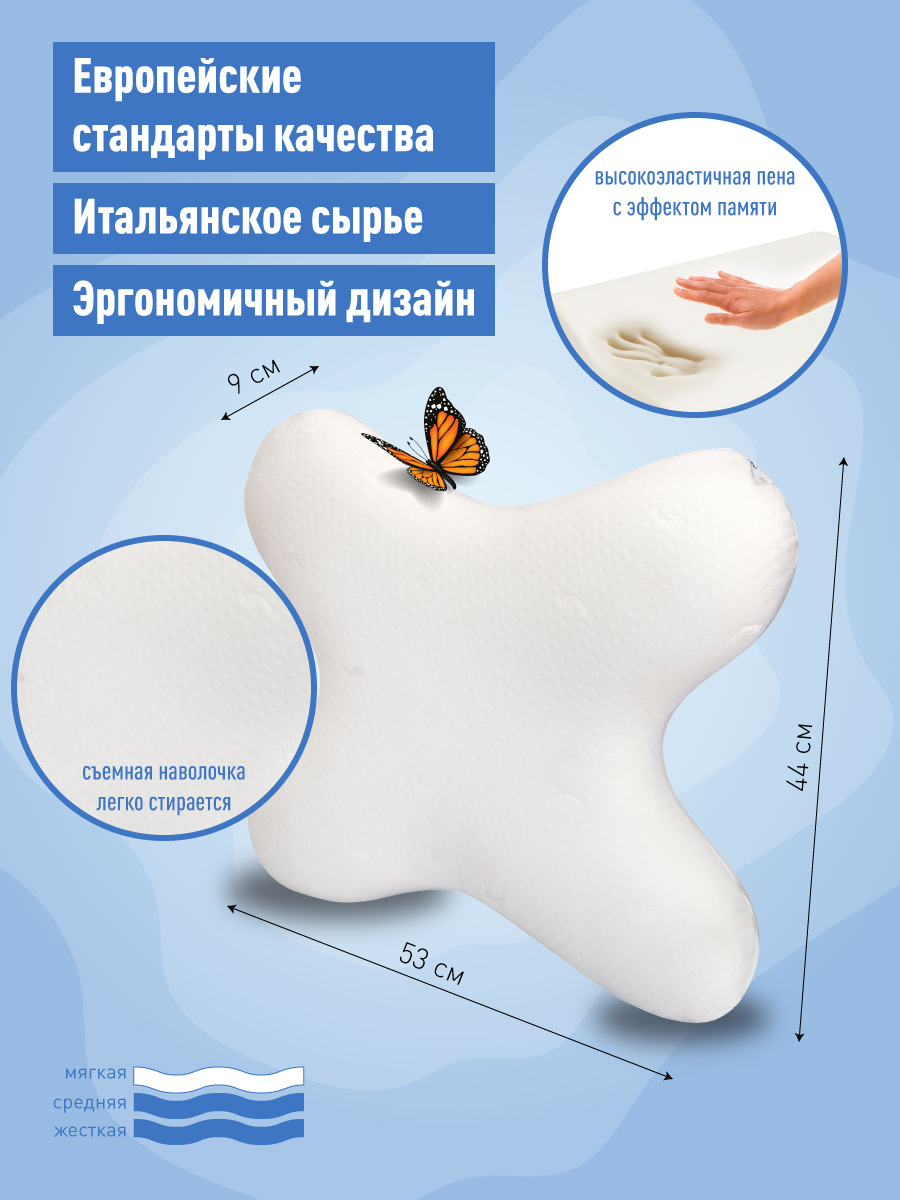 Ортопедическая подушка 44x59см, MemorySleep Butterfly, высота 9 см