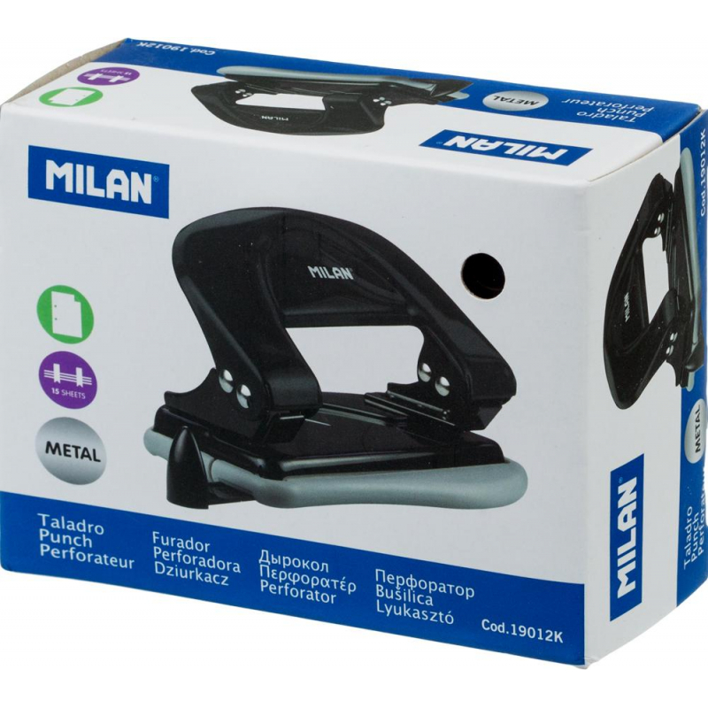 Дырокол Milan, до 15 листов, черный, металл. корпус, в карт.коробке 19012K