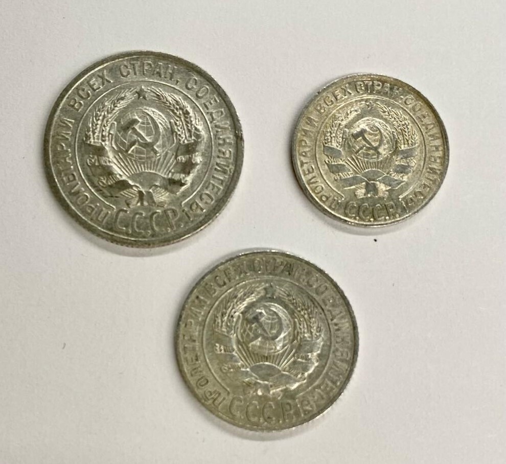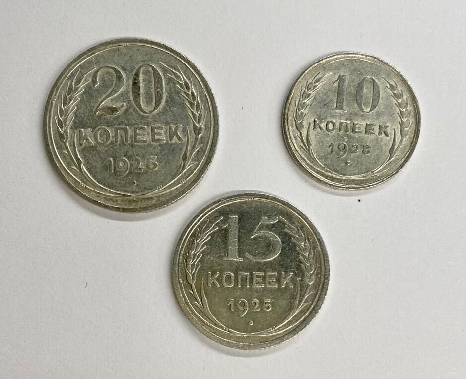 Набор из трех серебряных монет СССР 1924-1930 гг. (10, 15, 20 копеек).