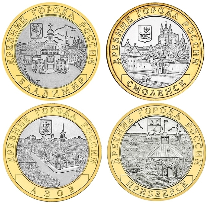Полный набор биметаллических монет 2008 года серии "Древние города России" (4 штуки).