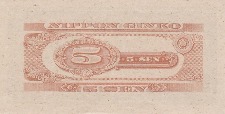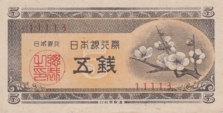 Банкнота номиналом 5 сен. Япония. 1948 год.